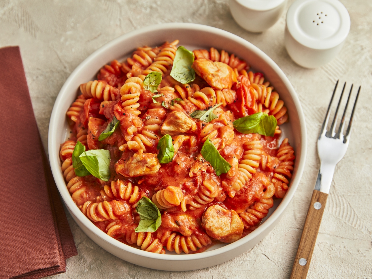 Snadná a rychlá příprava a tak lahodný výsledek! Naše těstoviny s kuřecím masem a rajčatovou omáčkou z jednoho hrnce si vás okamžitě získají. Pokrm je hotový za pouhých 30 minut a při jeho přípravě ušpiníte pouze pouze jednu pánev.