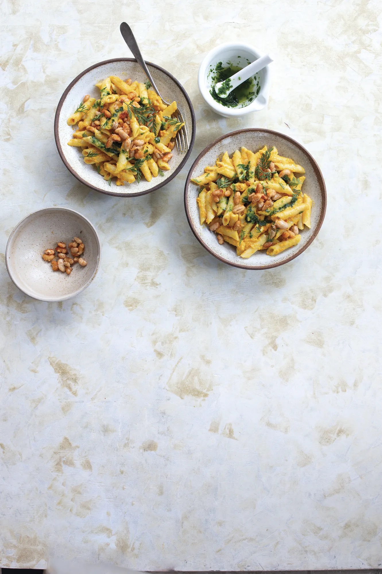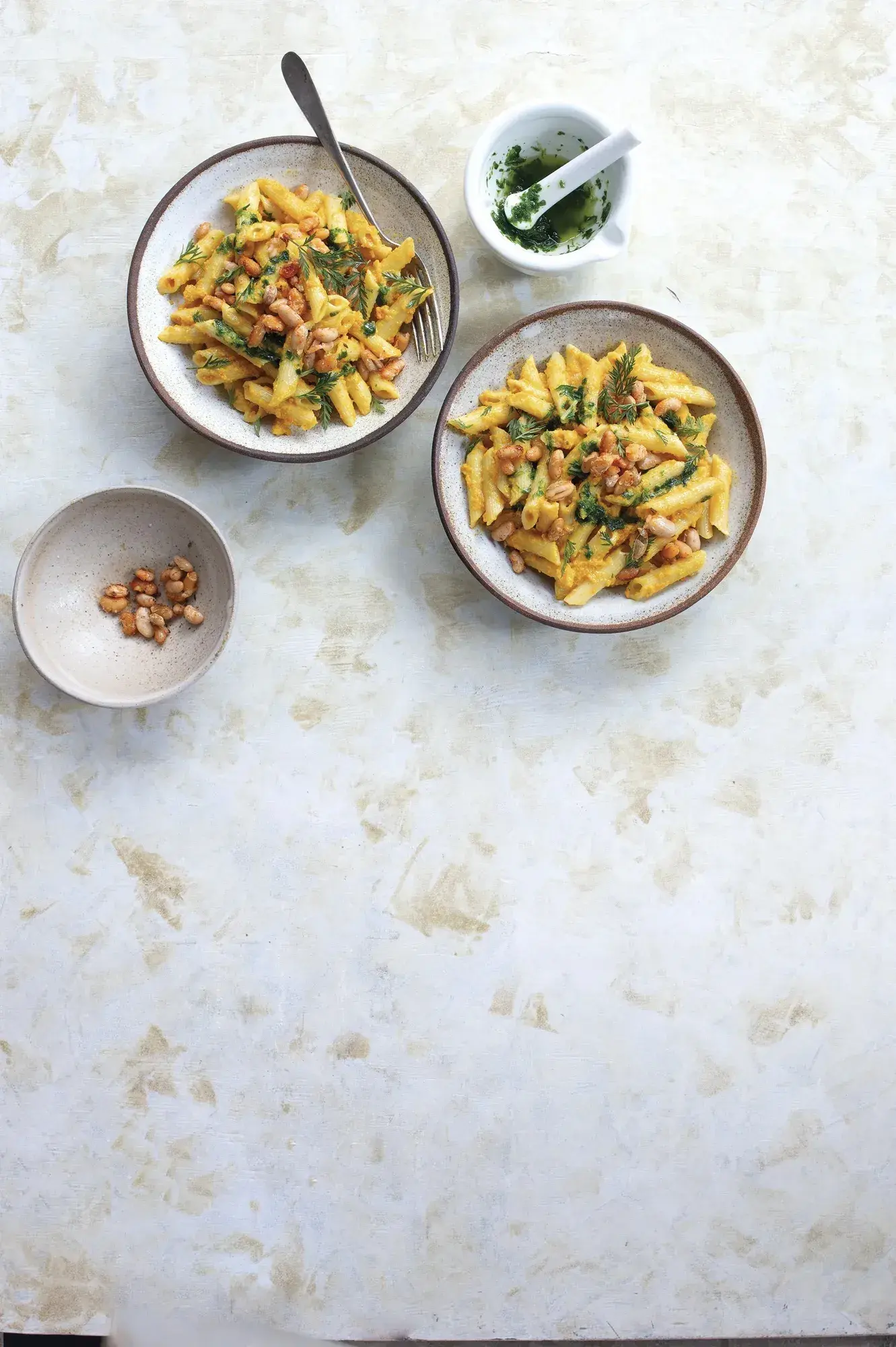 Těstoviny s omáčkou z pečené mrkve je snadné a skromné jídlo z pár běžných surovin, které je plné chutí i živin. K obyčejným těstovinám jsme totiž udělali skvělou krémovou omáčku z mrkve a fazolí. Fazole jako zdroj bílkovin najdete v těstovinách hned ve dvou podobách – v omáčce i jako křupavé kousky na ozdobu. Mrkev jsme zase využili do poslední snítky natě.