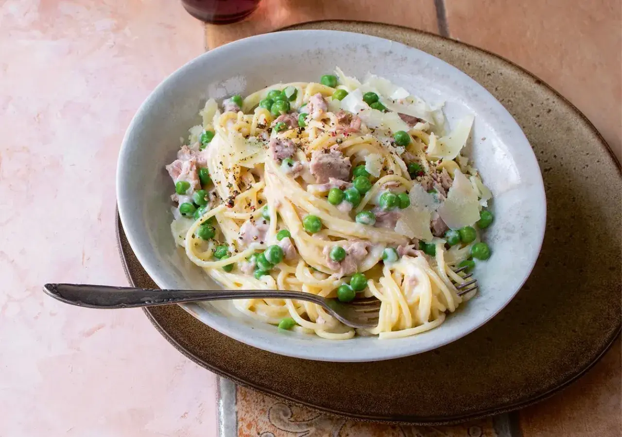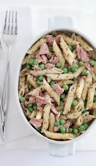 Těstoviny vždy slaví úspěch, zejména s krémovou omáčkou. A na tuhle nepotřebujete ani kapku smetany. Těstoviny s tuňákem můžou mít různou podobu. Hrášek je klasika, ale můžete jej vyměnit i za fazolky nebo kukuřici, zkrátka co je zrovna v mrazáku.