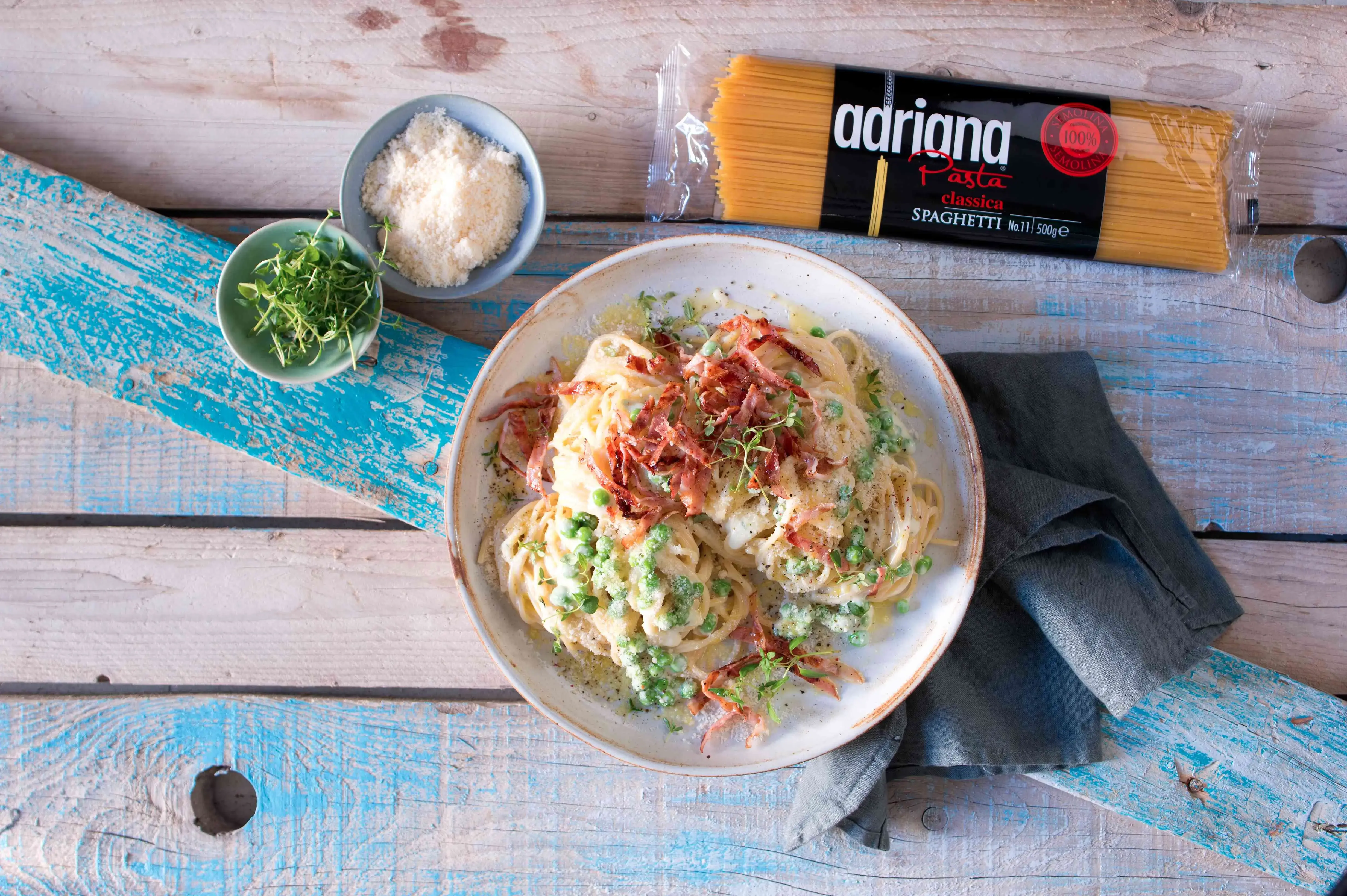 Chcete sebe a své nejbližší rozmazlit skvělým obědem či večeří? Připravte jim jejich oblíbené špagety značky Adriana se smetanovou omáčkou, pancettou a hráškem. Sklidíte ovace! Těstoviny se smetanovou omáčkou jsou velmi rychlé na přípravu a většinou vám postačí i to málo, co má většina z nás běžně v lednici a spíži. Pancetta má rozhodně své kouzlo, ale podobnou službu zastane i jiná slanina nebo kvalitní šunka.