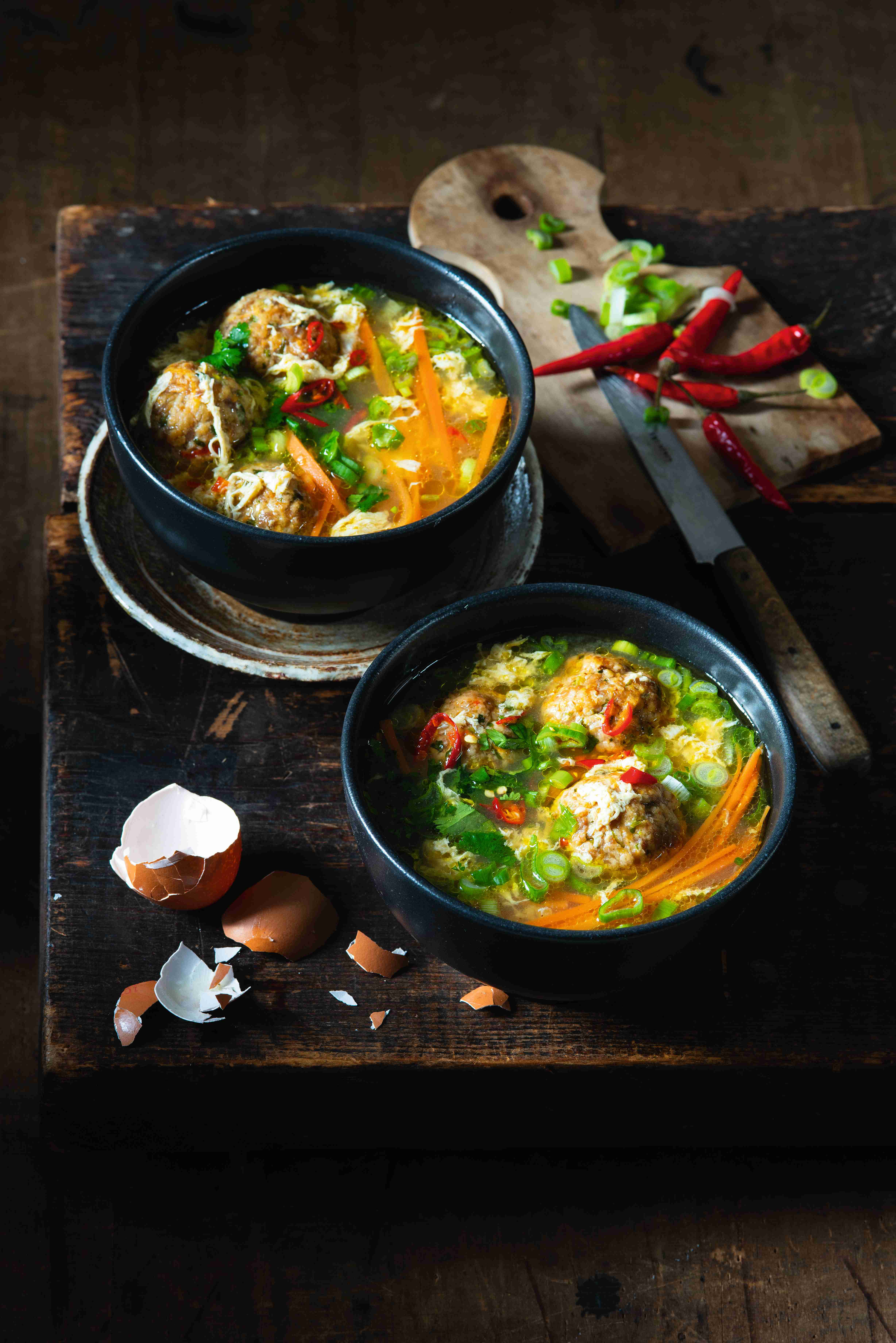 Tenhle recept si neklade za cíl autenticitu, ale thajskem inspirovanou, chutnou, výživnou a rychlou polévku pro zahřátí nejen pro případ, že by i aprílové počasí ještě vybízelo k pobytu za kamny. Kuliček si můžete napéct víc a po vychladnutí je zamrazit na jindy – pak už je stačí jen důkladně prohřát v polévce.