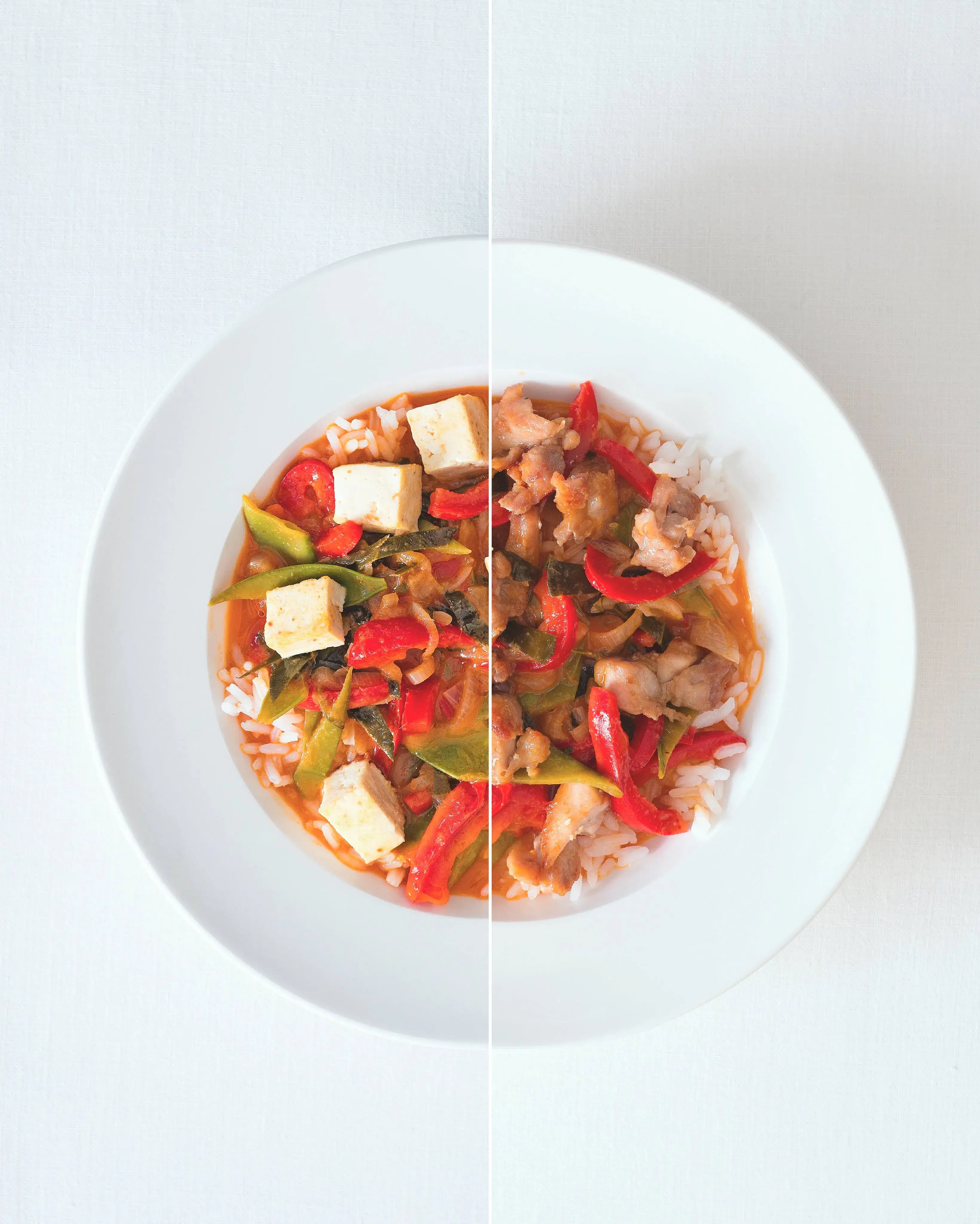 Bleskové červené kari je plné chuti a jde skvěle dohromady jak s tofu, tak s kuřecím masem. Báječně chutná i jenom se zeleninou. Thajské červené kari jsme připravili ve dvou verzích – jednu porci s tofu pro vegetariána, zbylé tři s kuřecím masem. Ideální recept na rychlé jídlo pro strávníky takového složení.