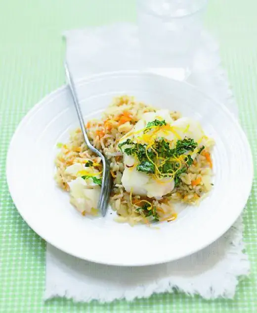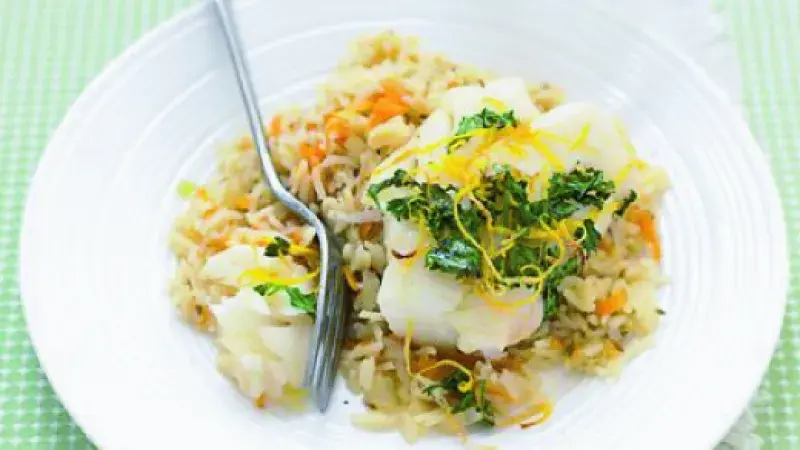 Lehká ryba vytváří s mrkvovým pilafem dokonale zdravou večeři. Maximální chuť a minimum kalorií a tuku!