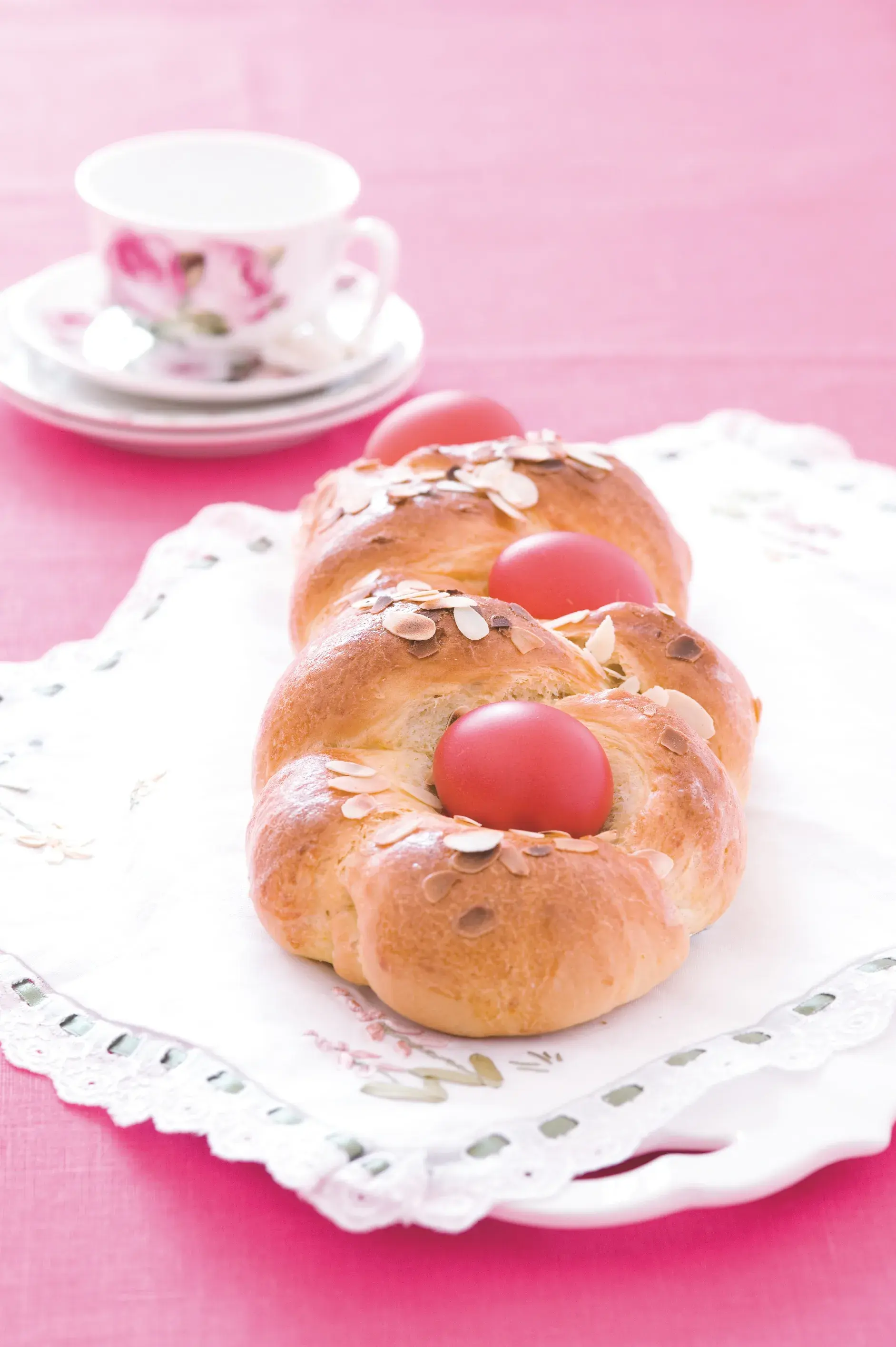 Načerveno obarvená vajíčka na řeckém velikonočním tsoureki symbolizují nový život. Na koho vyjde kousek s vejcem, toho prý čeká šťastný rok.