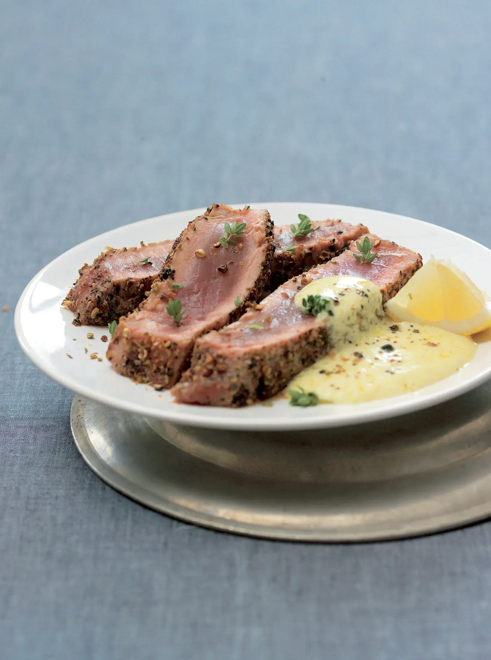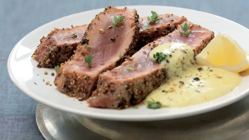 Tuňákové steaky se žloutkovou omáčkou a citronovou šťávou.