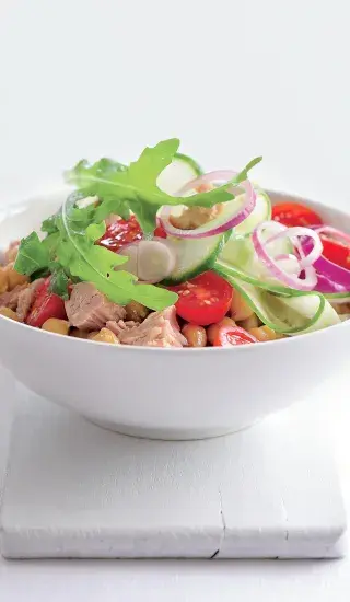 Kuskus má mnohostranné využití. Smíchejte ho s tuňákem, zeleninou a bylinkami, za chvilku máte chutný salát. Recept berte jako inspiraci, protože příště můžete zvolit jinou zeleninu nebo upravit zálivku. Salát z kuskusu je výborný studený, proto pokud vám nějaký zbude, vezměte si ho druhý den do práce a nemusíte si lámat hlavu, kde si jídlo ohřejete.