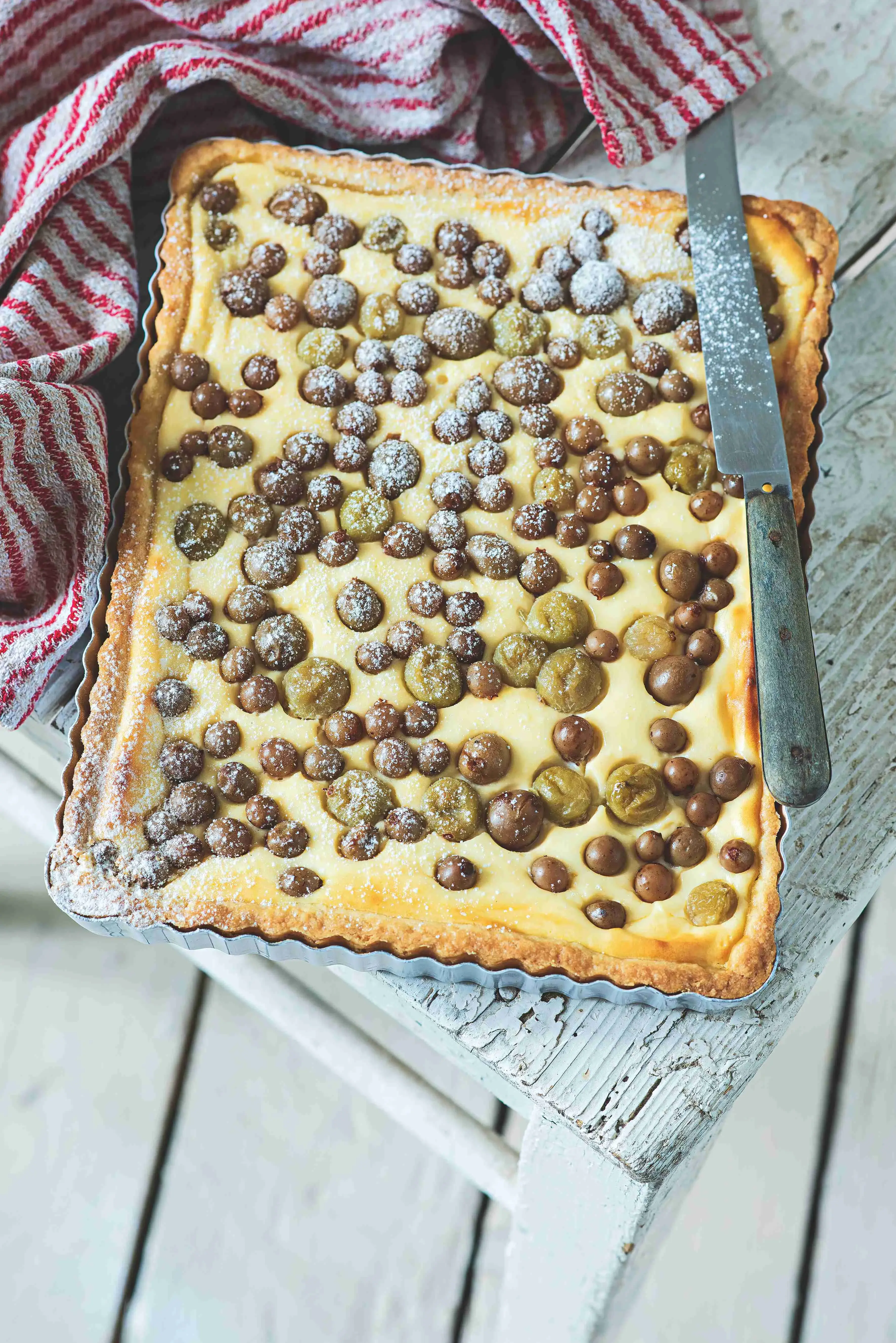 Hedvábný tvaroh a kyselkavý angrešt tvoří báječný pár. Koláč rozjasní červený angrešt nebo kombinace angreštu s jostou.