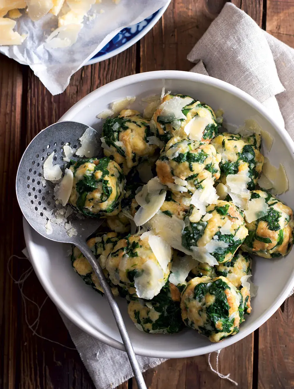 Nehltejte, i když to k tomu svádí. K těmto knedlíkům ani nebudete potřebovat maso... Tyrolské knedlíčky se špenátem a gruyérem jsou výborné jen tak pokapané máslem a s parmazánem. Tak jednoduché to může být.