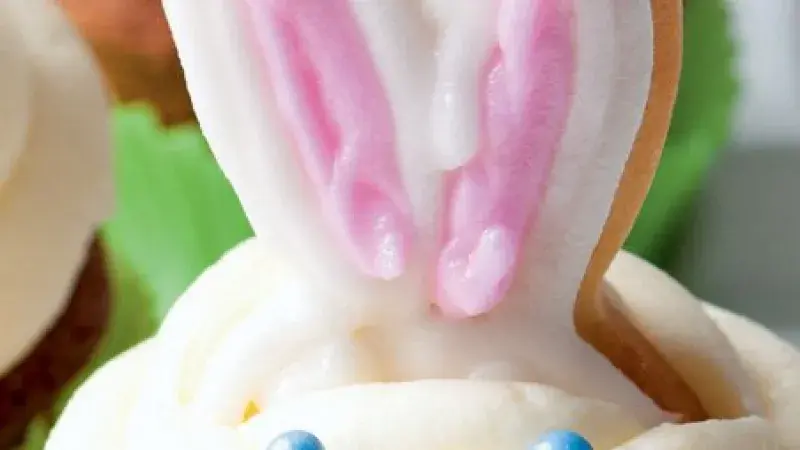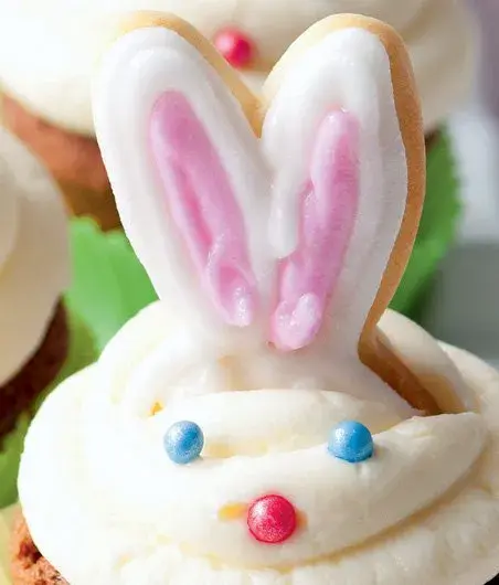 Tahle sladká ušiska k nakousnutí jsou ve skutečnosti máslové sušenky. Stačí je nazdobit polevou a zapíchnout do krému zaječích dortíků a velikonoční zajíček je na světě!