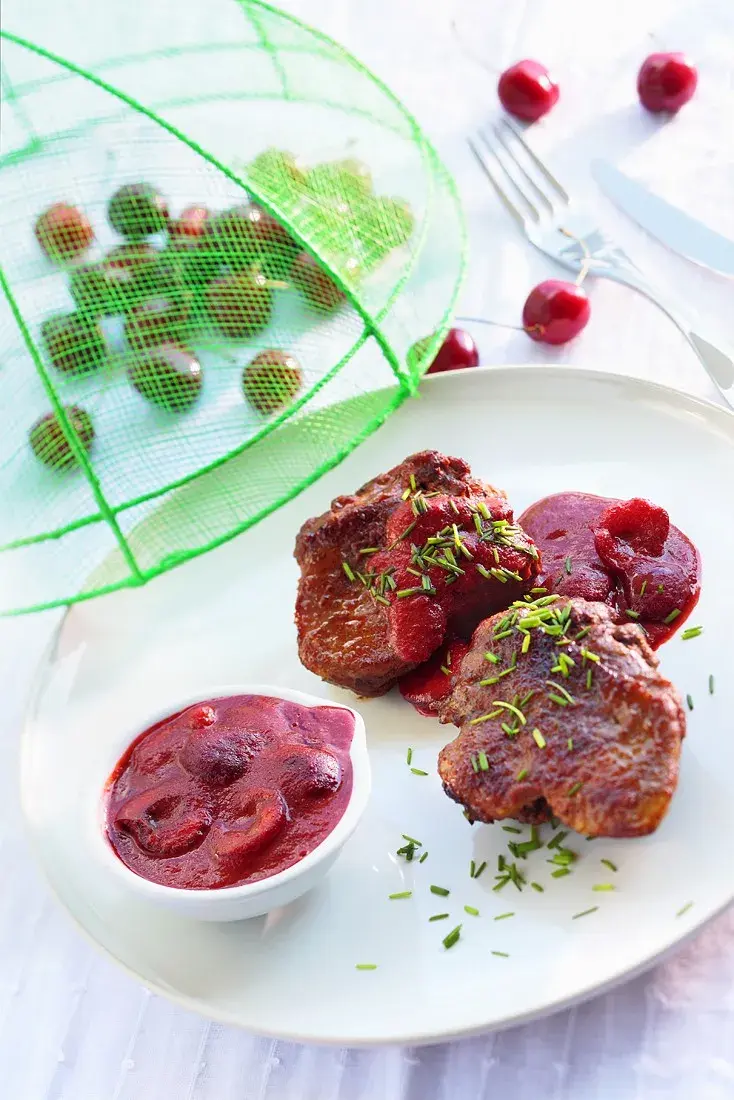 Ovoce překvapivě dobře ladí se šunkou a uzeným, a rozhodně to nemusí být jen ananas, ozdoba takzvaných havajských toustů, či celé šunky pečené nasladko. V našem případě pikantní třešňová zavařenina příjemně odlehčuje slané maso. Připravuje se podobně jako indické čatní; tyto pikantní směsi ovoce, zeleniny a koření s více či méně ostrou sladkokyselou chutí jsou velmi oblíbené a podávají se jako chuťovka.