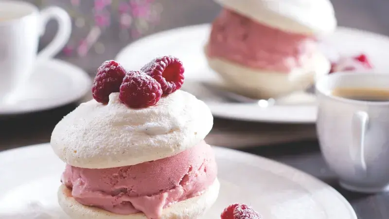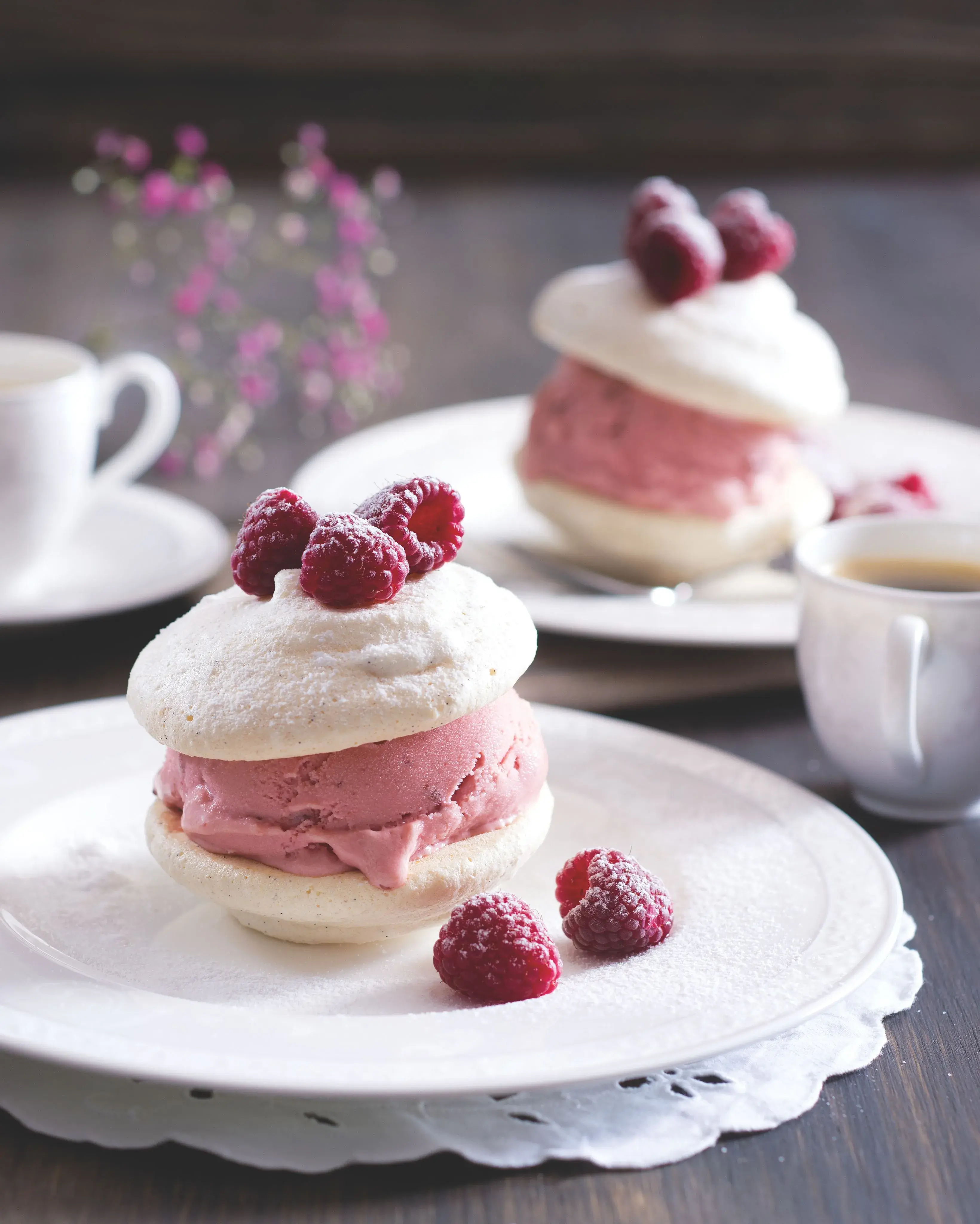 Po prvním zakousnutí se budete roplývat stejně jako křehké mandlové pusinky s malinovou zmrzlinou ve vašich ústech.