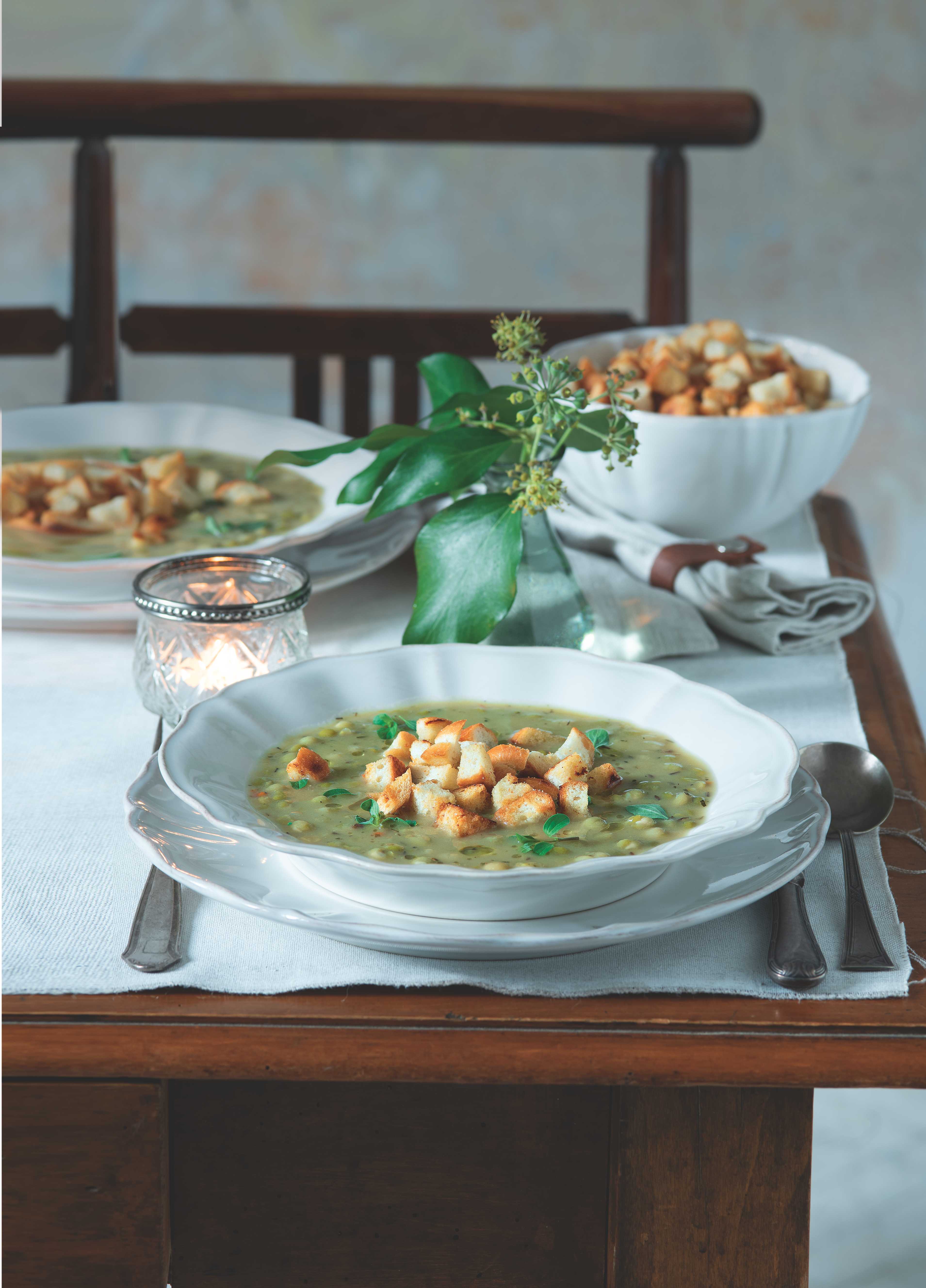 V rodině naší produkční Míšy Englišové se o Vánocích podává tato hrachová polévka podle rodinného receptu. „Jako malá jsem ji na Štědrý den nechtěla a maminka vždycky říkala: ,Tak ji nejez, aspoň uvidíš zlatý prasátko.‘ Teď ji miluju a jedla bych ji pořád, nejen o Vánocích,“ směje se Míša. Hustá polévka z hrachu voní saturejkou a majoránkou a k podávání nesmí chybět křupavé krutony.