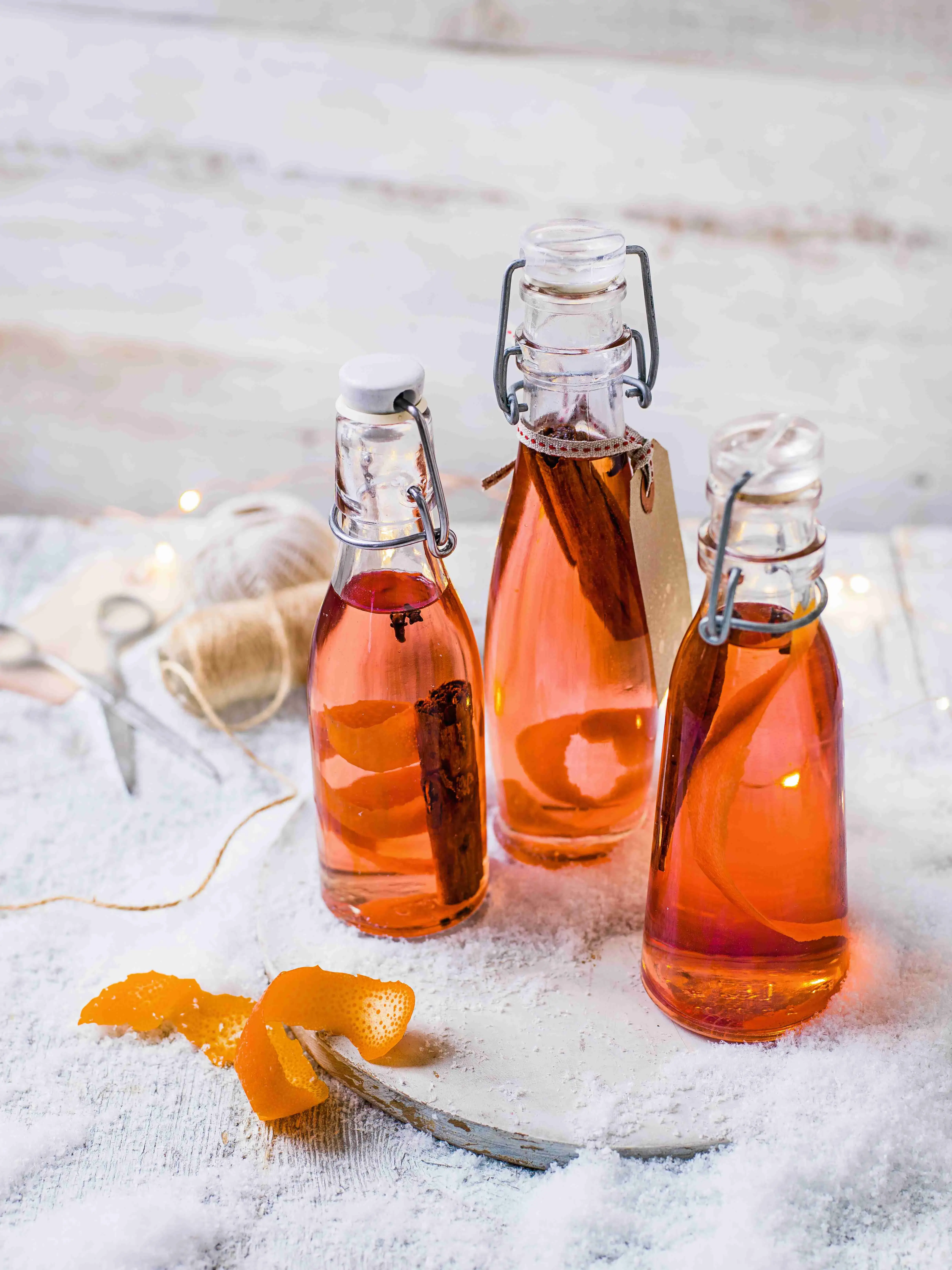 Vánoční koktejl si zaslouží slavnostní lahvičku. Můžete jej namíchat do jedné velké (500 ml), nebo rozdělit do vícero malých a dát každému jeden koktejl. V tom případě nezapomeňte navýšit množství koření, aby v každé lahvičce byl kousek svitku skořice, hřebíček a kůra z pomeranče.