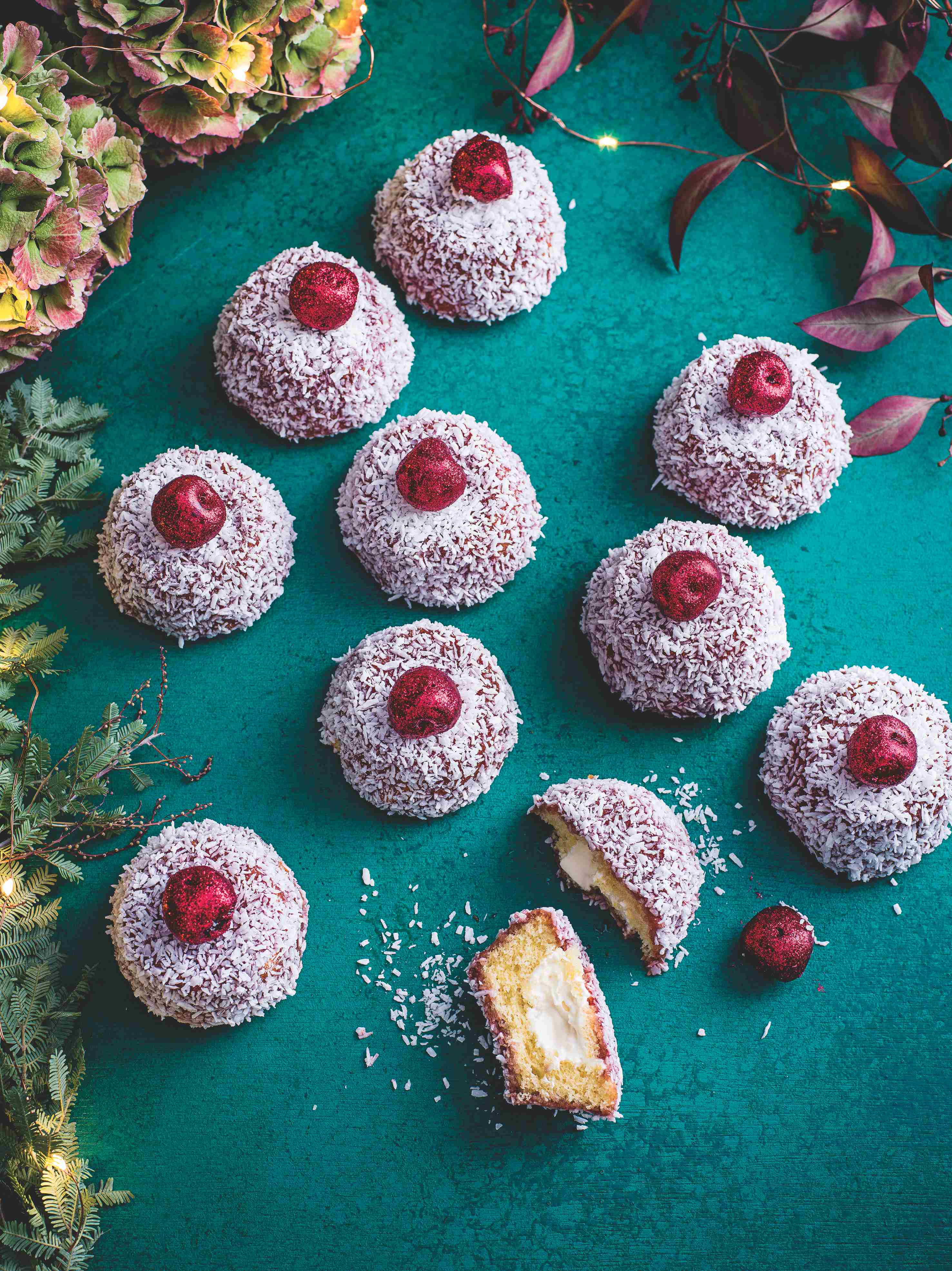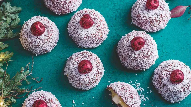 Lamingtonky jsou australský dezert: čtverečky těsta obalené v čokoládě a následně kokosu, někdy uprostřed protřené džemem. Tyhle vánoční nejsou v čokoládě, zato mají navíc šlehačku, a pokud se vám podaří sehnat jedlé třpytky nebo třpytivý prášek, zazáříte s nimi, kamkoli je donesete!