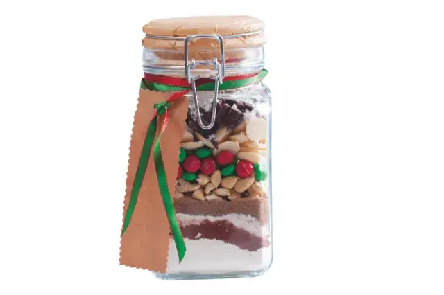 Takhle má vypadat dokonalý polotovar – ve sklenici krásně naskládané kvalitní suroviny a k tomu jednoduchý návod, jak si z obsahu sklenice připravit křupavé sušenky plné čokolády.