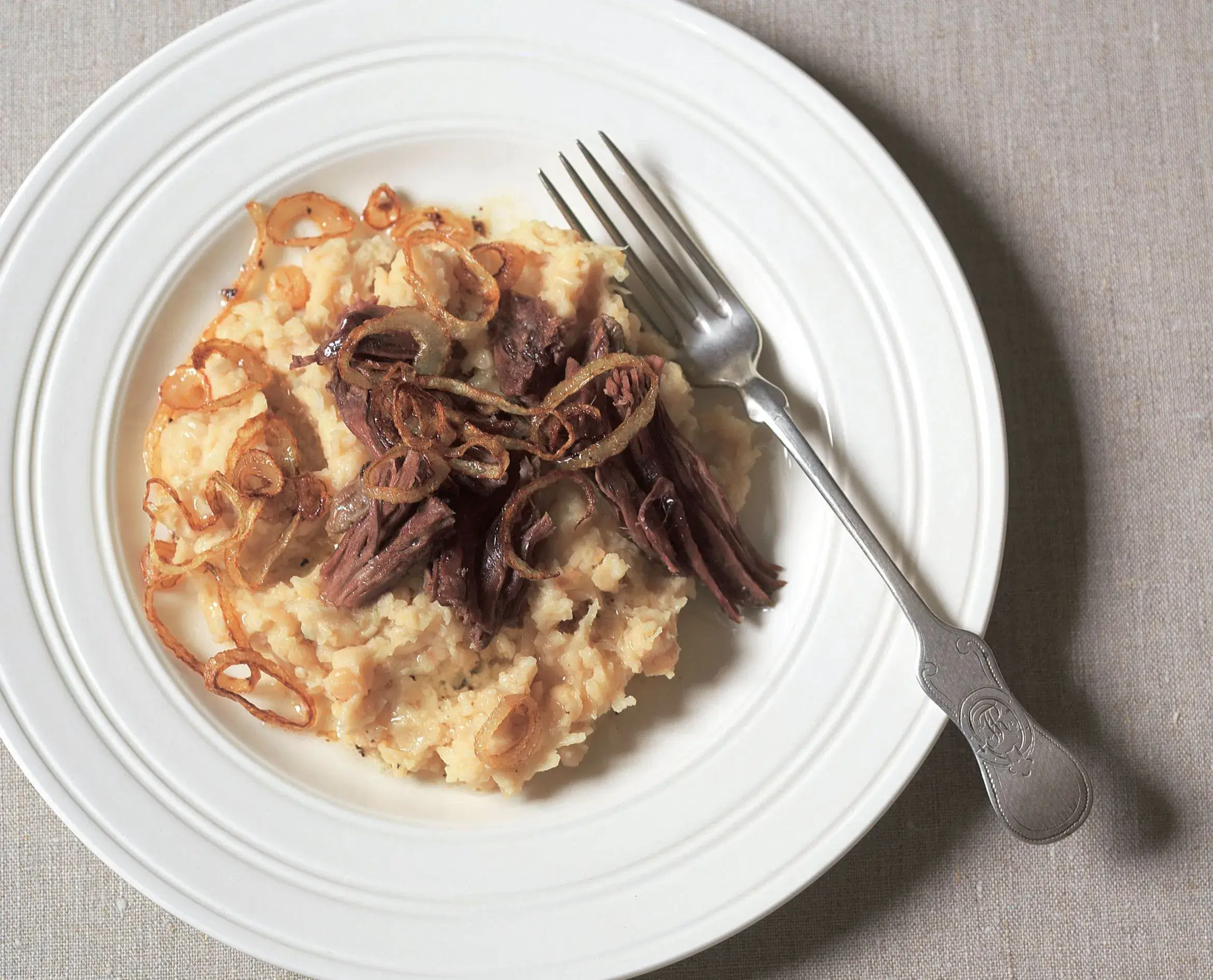 Zajímavá kombinace. Hovězí maso výborně chutná s hrachovou kaší ochucenou česnekem.