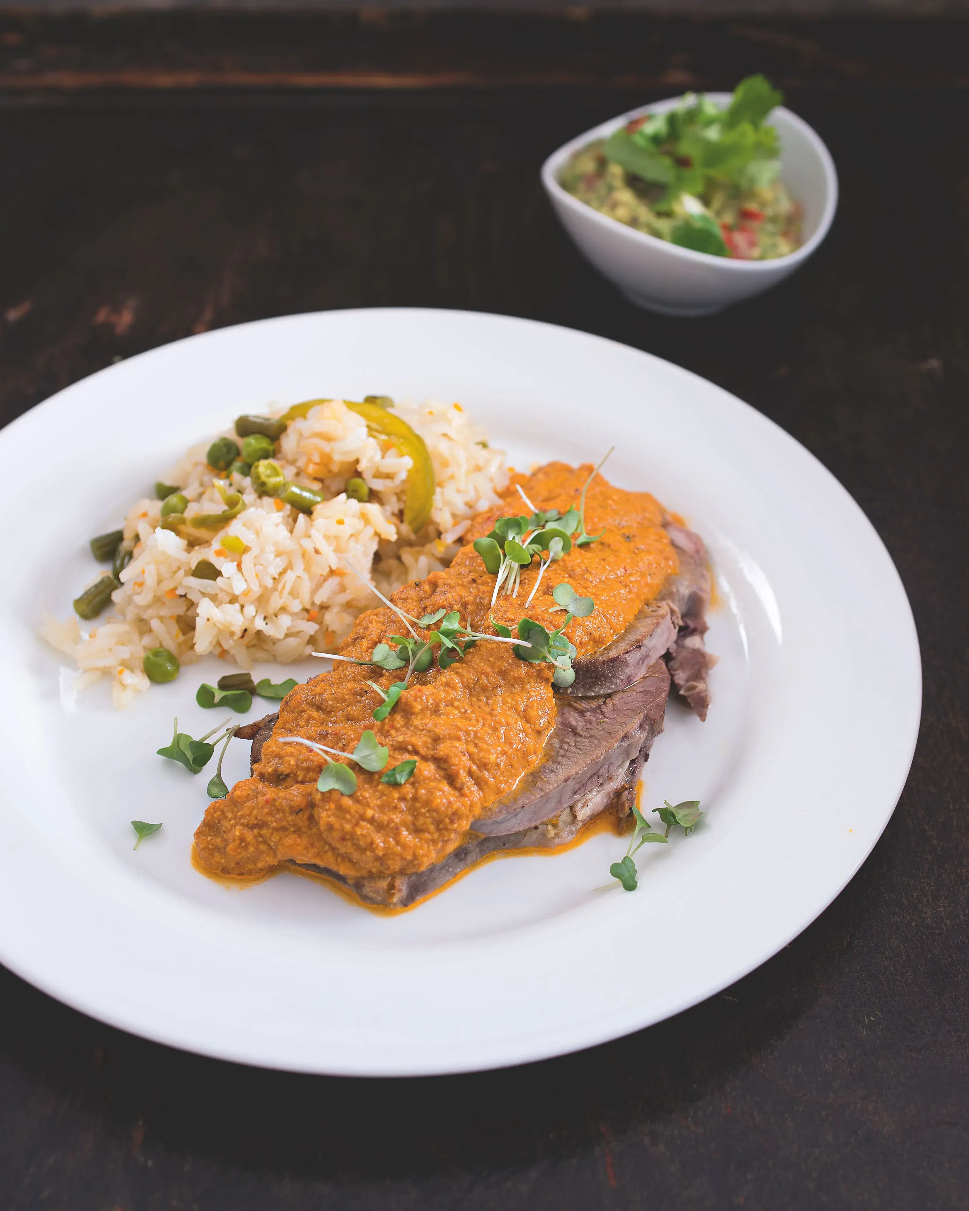 Jednoduchá chuť omáčky a skvělé jemné maso... Vlastně na tom nic není, ale chutná to absolutně skvěle! Ze všeho nejdřív dejte vařit hovězí jazyk, abyste získali vývar potřebný pro přípravu mandlové omáčky. Jazyk a omáčku doplňte barevnou rýží.
