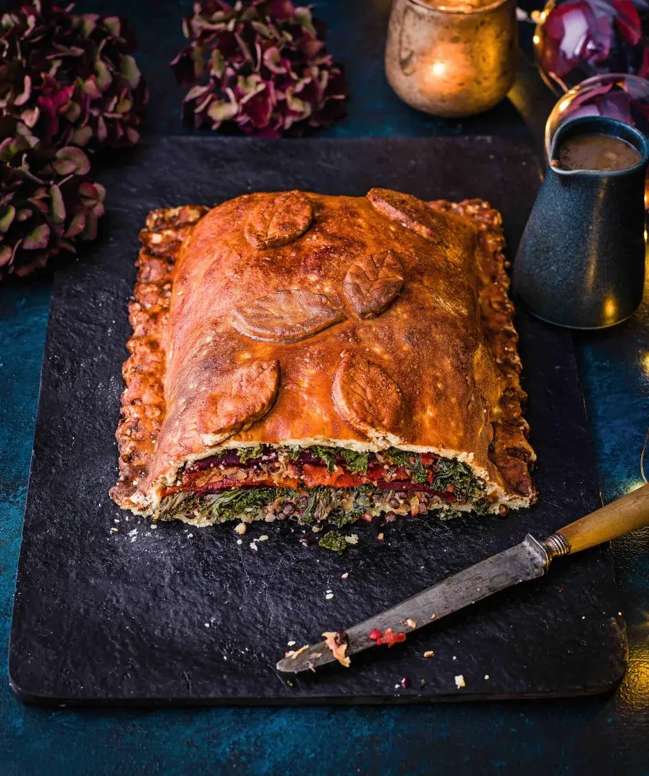 Slavnostní chvíle si žádá slavnostní lahůdku... A tou pečeně wellington rozhodně je. Pokud ovšem do vašeho jídelníčku maso nepatří, nebo chcete pohostit návštěvu, která maso nekonzumuje, dejte místo tradičního hovězího přednost této veganské variantě. V efektním kabátku z těsta se skrývá náplň ze zeleniny, luštěnin a ořechů.