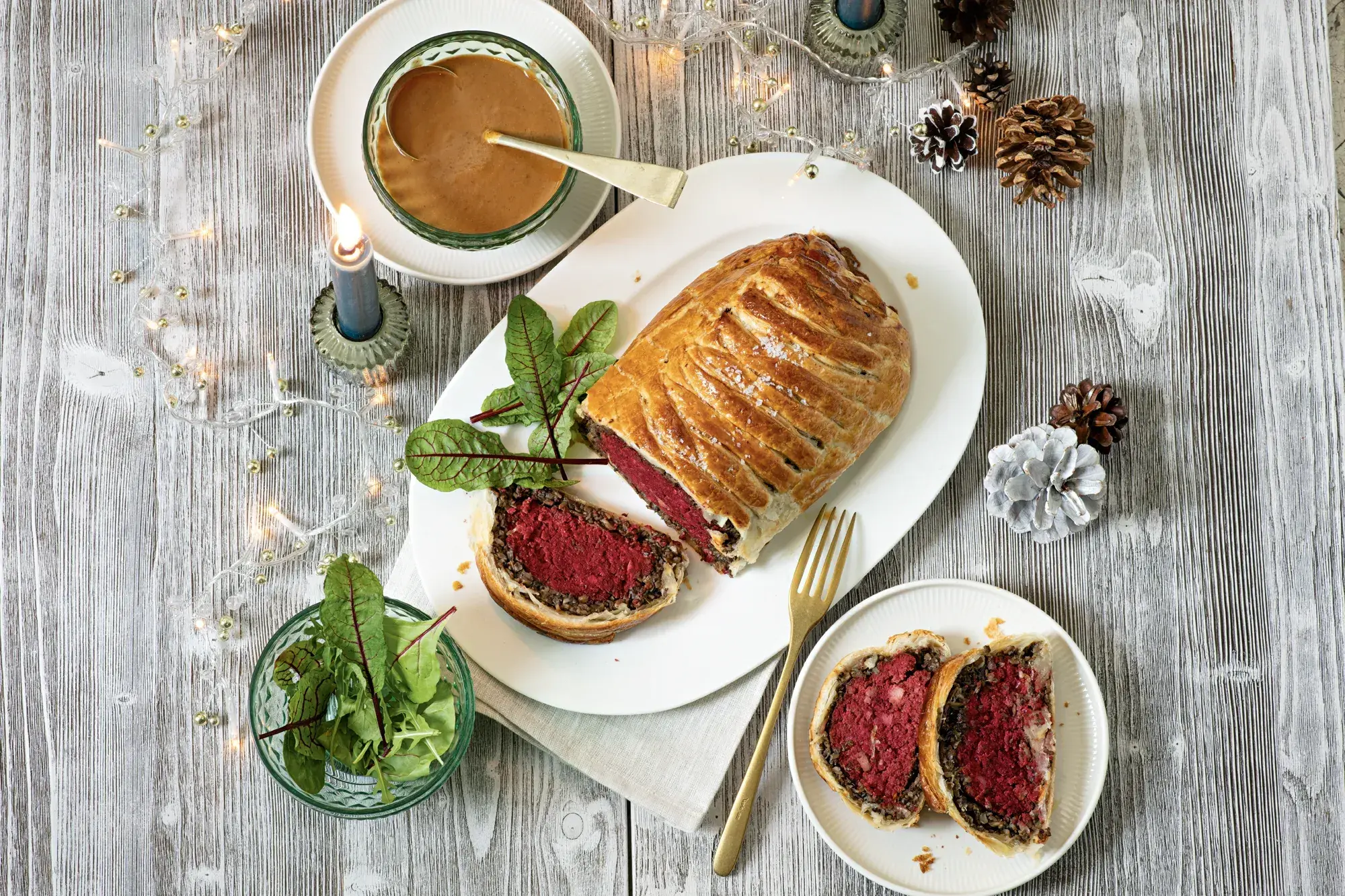 Vegetariánský Wellington z červené řepy je důstojnou alternativou k tradičním vánočním jídlům. Pečená řepa obalená ve směsi duxelles z žampionů a zabalená do listového těsta nabízí plnou chuť i slavnostní vzhled, aniž by bylo potřeba masa. Tento recept na Wellington se hodí jako hlavní chod pro vegetariány místo kapra nebo řízku a dobře zapadne do moderního vánočního menu. Na řezu vynikne kontrast řepy, bylinek a hub, díky čemuž působí stejně zajímavě, jako chutná.