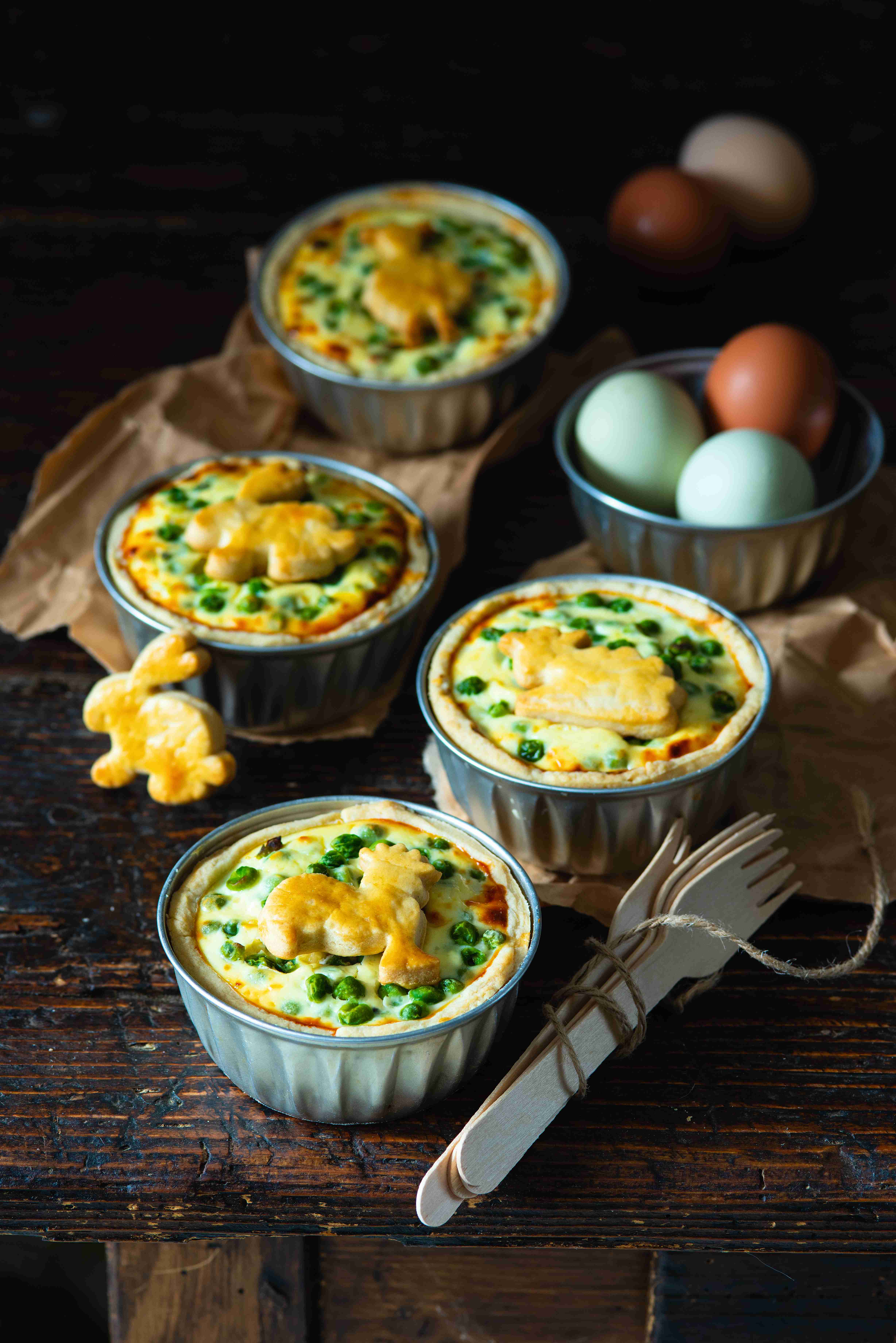 Slané koláčky čili miniquiche si díky jemné ricottové náplni s hráškem a ozdobě ve tvaru velikonočních zvířátek oblíbí hlavně malí koledníci.