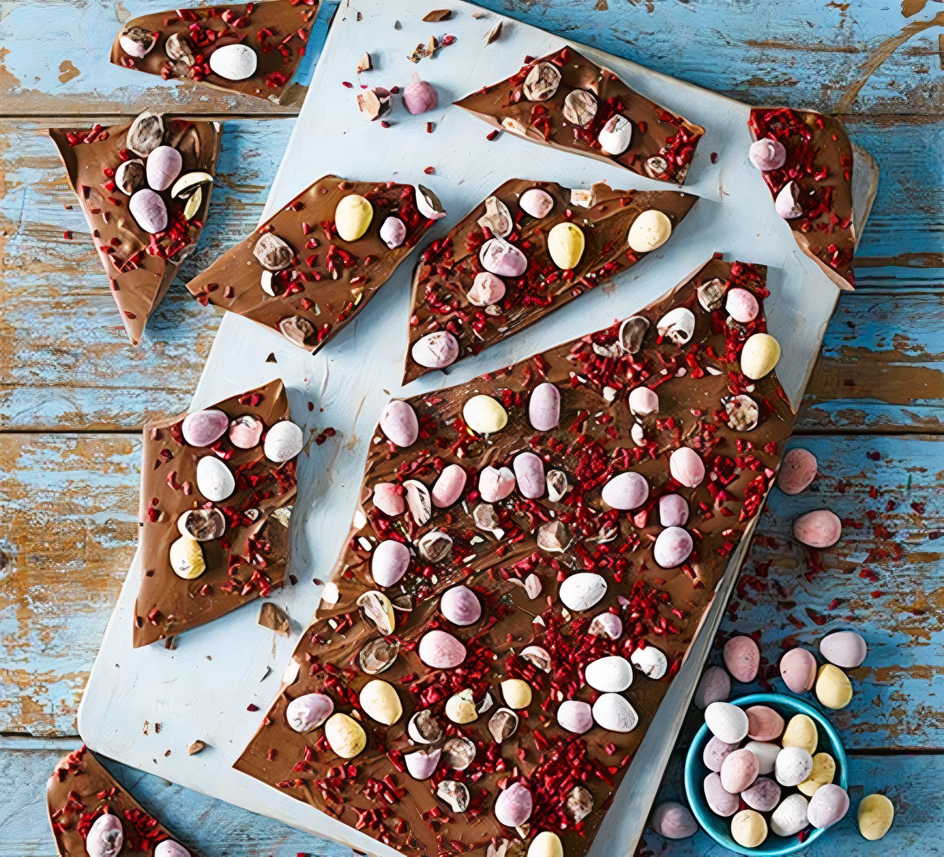 Velikonoční lámaná čokoláda je atraktivní pamlsek a zároveň perfektní alternativou k velikonočním vejcím. Lámanou čokoládu rozdělte do sáčků nebo krabiček a obdarujte jimi koledníky. Recept je dostatečně jednoduchý, aby si ho mohly připravit i děti.