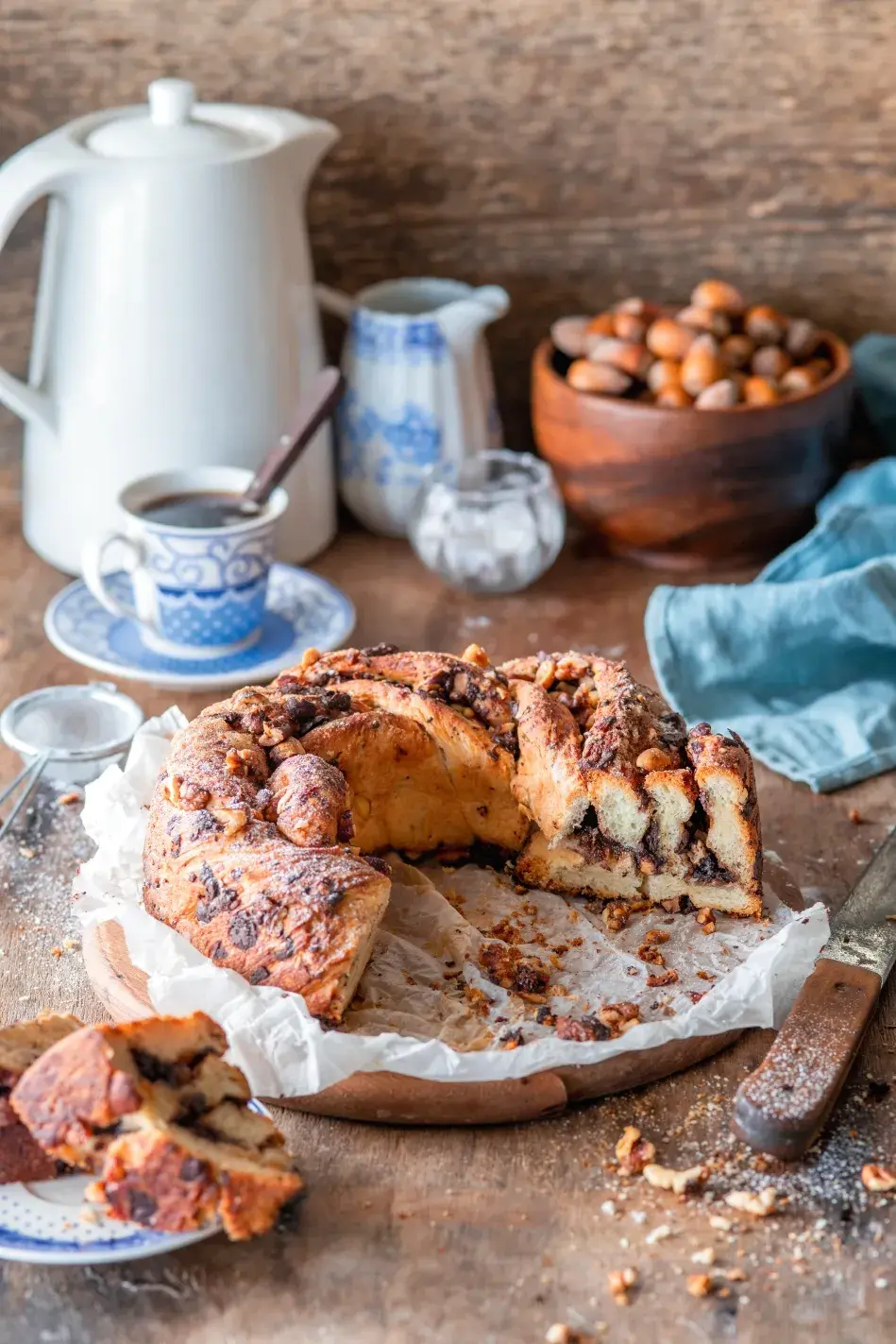 Při přípravě kynutého věnce s ořechovo-čokoládovou náplní myslete na to, že čokoláda v troubě vysychá. Nešetřete proto máslem. A čokoládu vyberte tu s obsahem kakaa kolem 50%, opravdu tmavou čokoládu schovejte na mlsání.