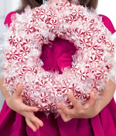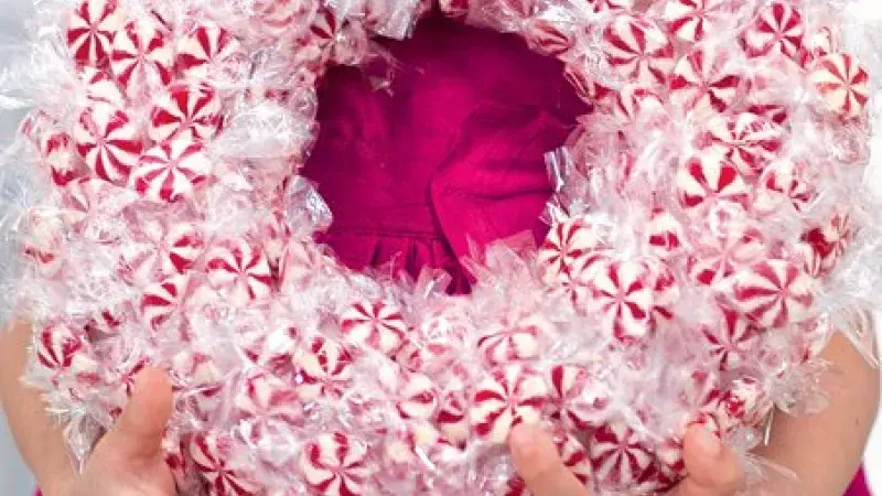 Na výrobu věnce si kupte hezky barevné bonbony. Pokud nebudou zabalené do průhledného celofánu, budete je muset nejdřív vybalit a pak do celofánu znovu zabalit, aby krása bonbonů vynikla. Pomáhat vám při tom mohou i děti.