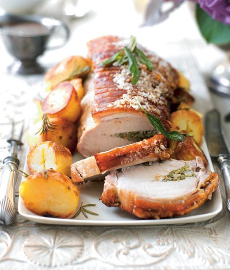 Pečínka s voňavou náplní a křupavé rozmarýnové brambory - ideální volba pro sváteční nedělní oběd.