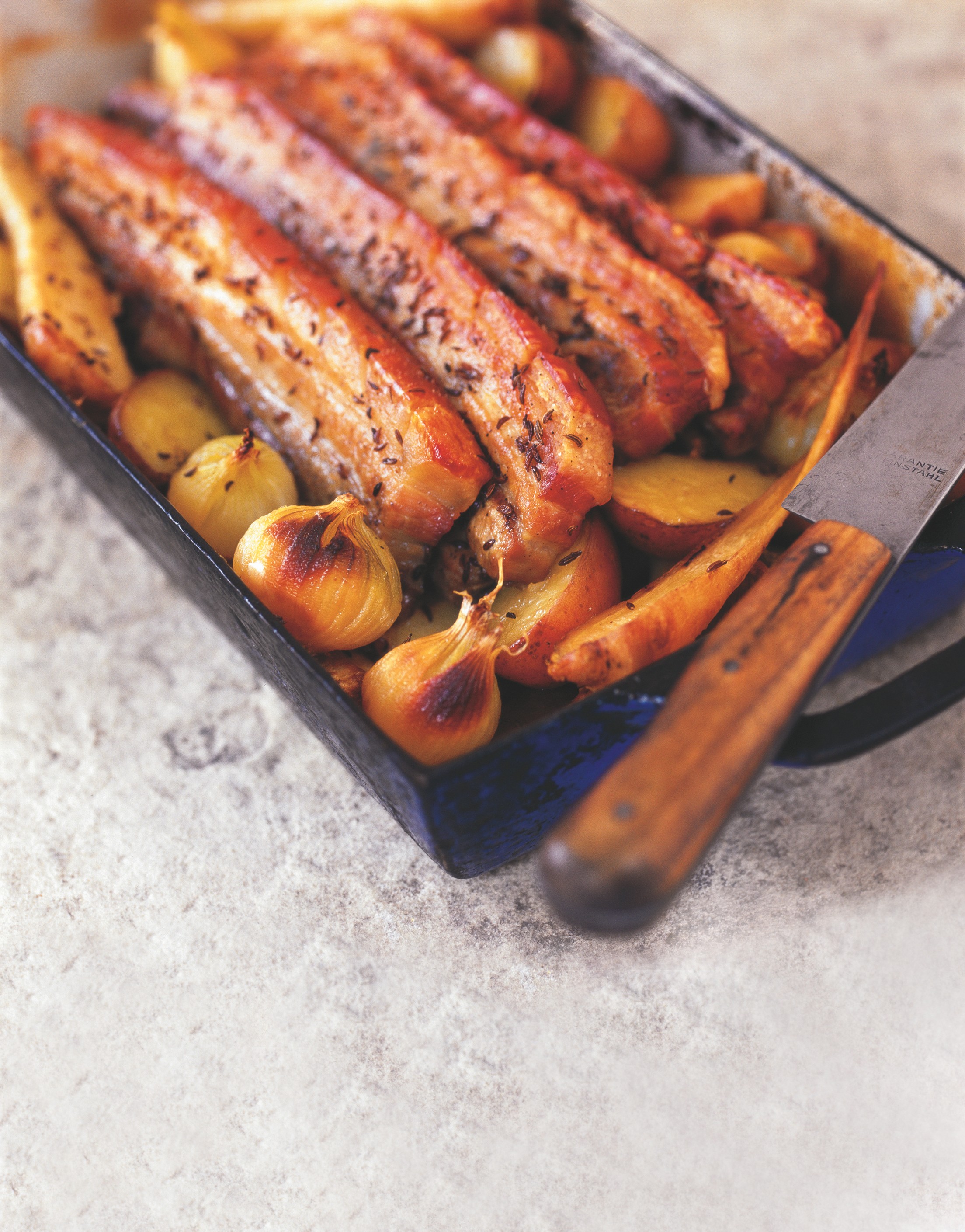 Vepřové (na kmíně) je pilířem české kuchyně, ale dnes jeho půvaby začínají objevovat i jinde – a vůbec to nemusí být ten nejlibovější a nejdražší kousek! Podestýlka z brambor a zeleniny, které poslouží jako příloha plná úžasné vypečené šťávy, je skvělou inovací ve stylu Jamieho Olivera.