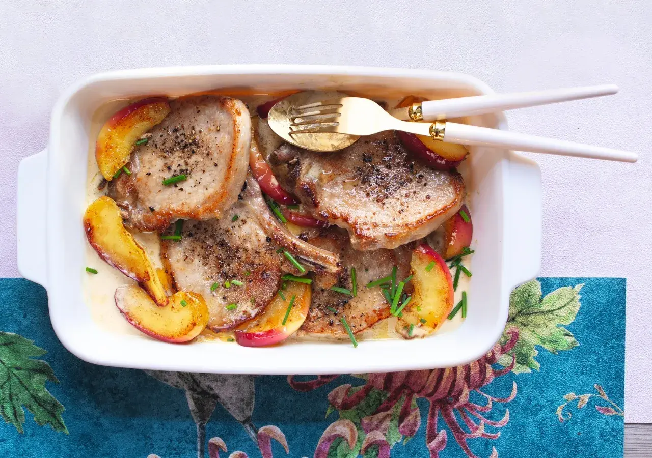 Jablečný cider dodá jídlu lehkou kyselinku a podpoří chuť jablek. Tato kombinace se k vepřovým kotletám dokonale hodí. Navíc celé jídlo máte za pár minut na stole a zvládnete ho nachystat i jako večeři po náročném dni.