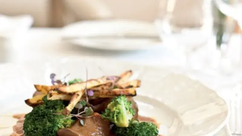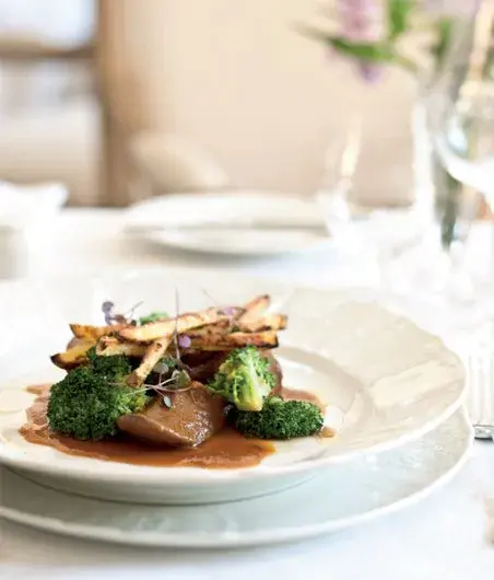 PODÁVÁNÍNejdřív na talíř naaranžujte tři kousky jazyka (včetně špičky) a polijte ho omáčkou. Pokud mezitím vychladla, velmi zlehka ji ohřejte. Pomocí kleští nebo kuchařské pinzety dejte mezi jednotlivé kousky masa růžičky brokolice, aby se talíř pěkně prozářil. Nakonec vyskládejte navrch hotové, dozlatova upečené hranolky. Stačí jich jen pár, ostatní můžete dát doprostřed stolu do mističky, aby si každý mohl přidat.