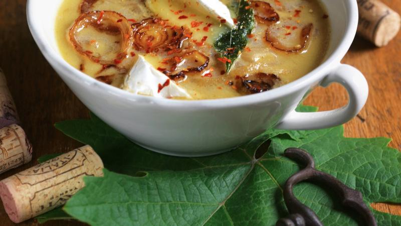 Proslulá pařížská cibulačka se nezapře jako vzor této pikantní polévky, spojené s vinobraním ve Francii.