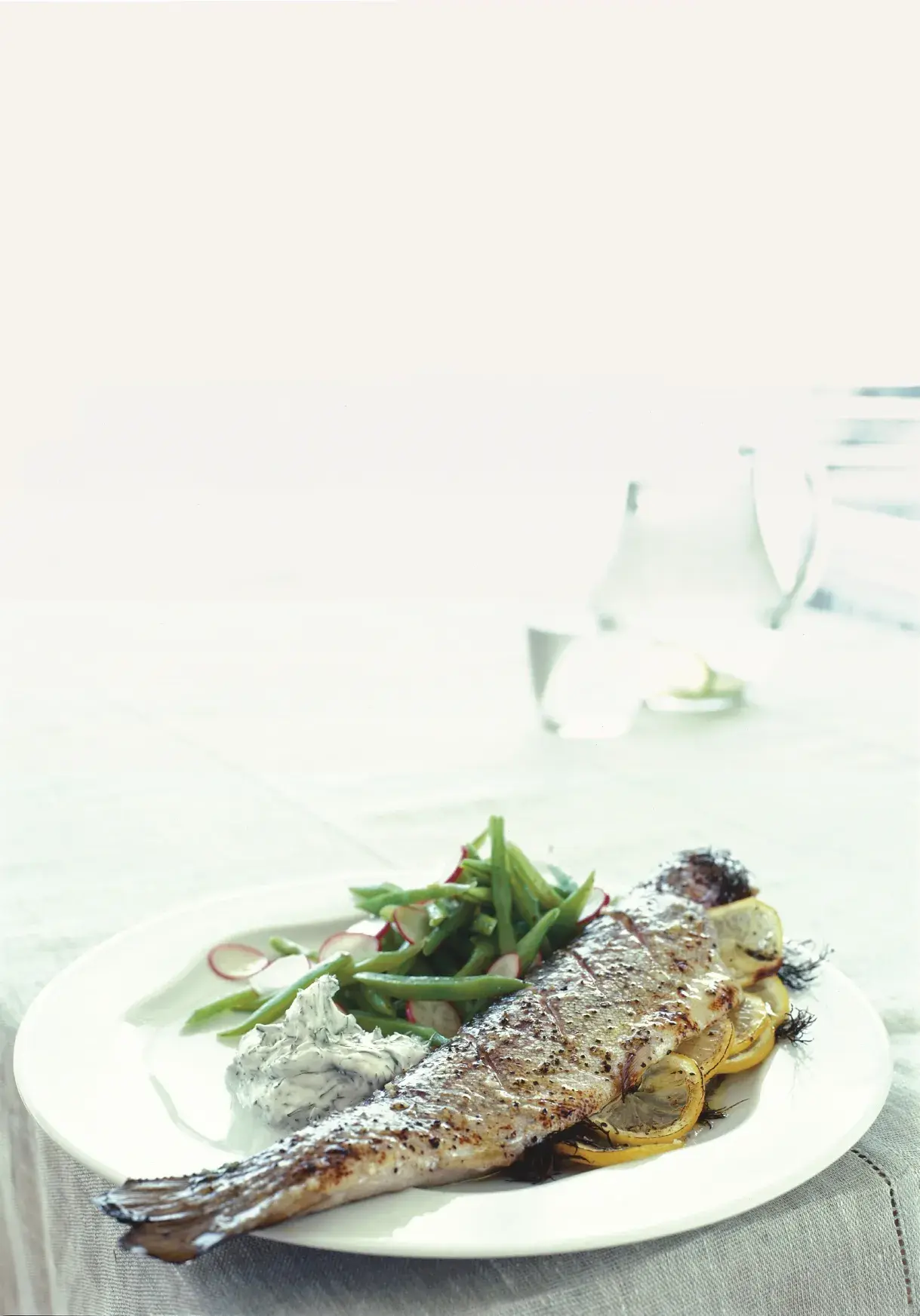 Malý pstruh je ideální pro přípravu vcelku. Ryba je jemná, ale šťavnatá a výrazná. Lehký ‚zahradní‘ salát je příjemně osvěžující a využijete v něm vlastní produkci, hlavně fazolky. Samozřejmě ale můžete použít i mražené.