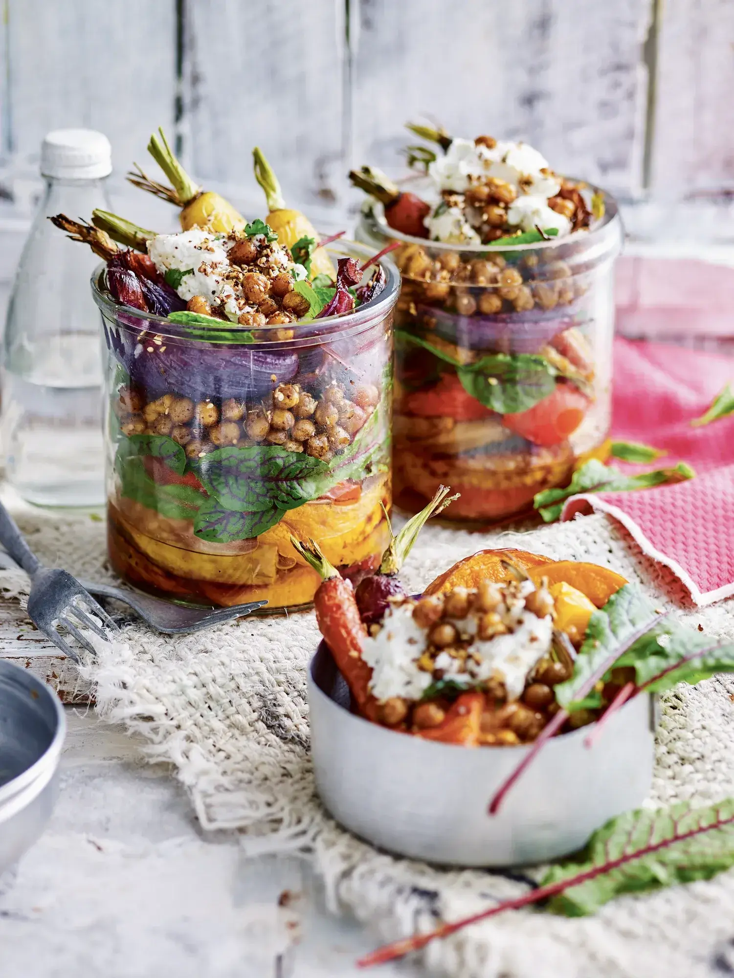 Zeleninu a opečenou cizrnu vrstvěte do vysoké uzavíratelné sklenice a vezměte si salát s sebou do práce nebo na výlet. Pokud ho chcete připravit na dva až tři dny dopředu, začněte vrstvení zálivkou – jen tak zůstane zelenina křupavá a čerstvá.