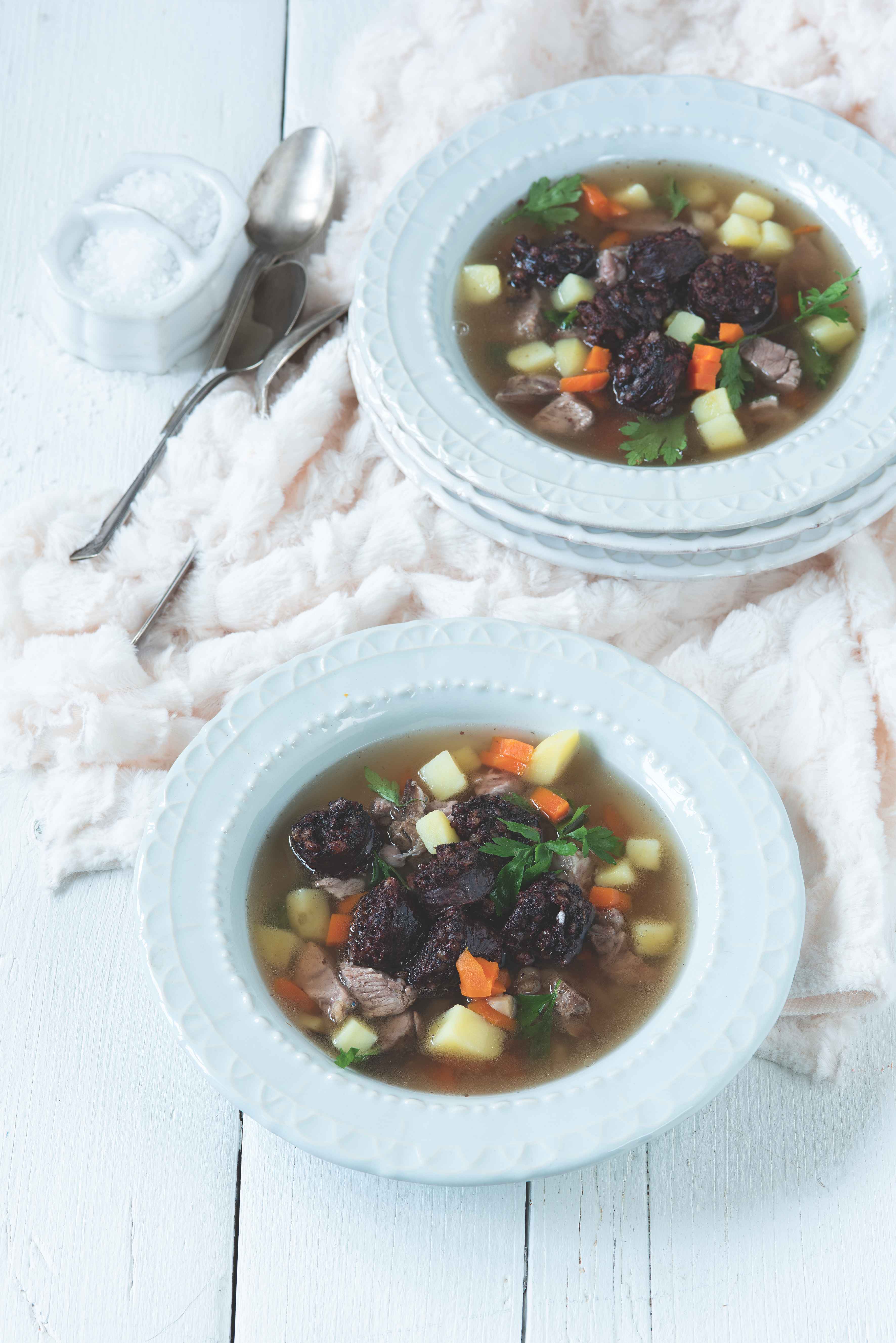 Tuhle polévku si můžete uvařit kdykoli samostatně, anebo na ni lze zužitkovat vývar a trochu masa od vaření jitrnic. Koleno, které nepřijde do polévky ani do jitrnic, snězte jako ovar. Velkou výhodou je, že kroupy jsou schované v jelítku a to se dá podávat zvlášť, ne všichni je totiž milují.