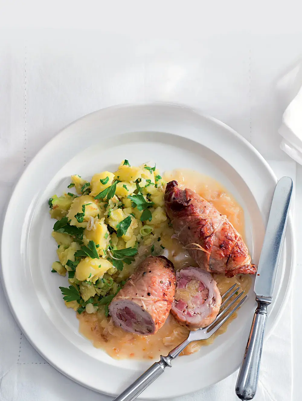 Vepřové, uzené a zelí – zaručená trojkombinace, na které si vždy pochutnáte. Záhorácký závitek milujeme se šťouchanými bramborami, ale podávat jej můžete i s knedlíkem nebo rýží. Jestli jste závitky s kysaným zelím a slaninou nikdy neochutnali, teď je ten správný čas. Podle našeho receptu je zvládnete uvařit raz dva.