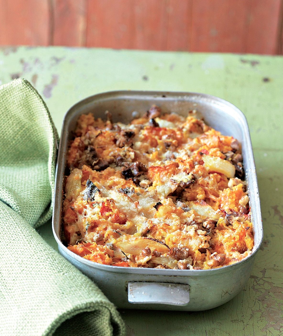 Zapečená dýně s jáhly a s kysanou zeleninou je super jednoduchý recept na bezmasé jídlo z jednoho pekáče. Křupavé ořechy navíc dodají zajímavou konzistenci a další chuťový rozměr. Stejným způsobem můžete namísto dýně zapéct také brambory nebo cukety. Jednoduchý recept s jáhly a pečenou zeleninou.
