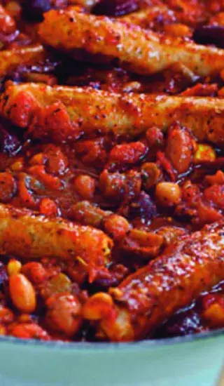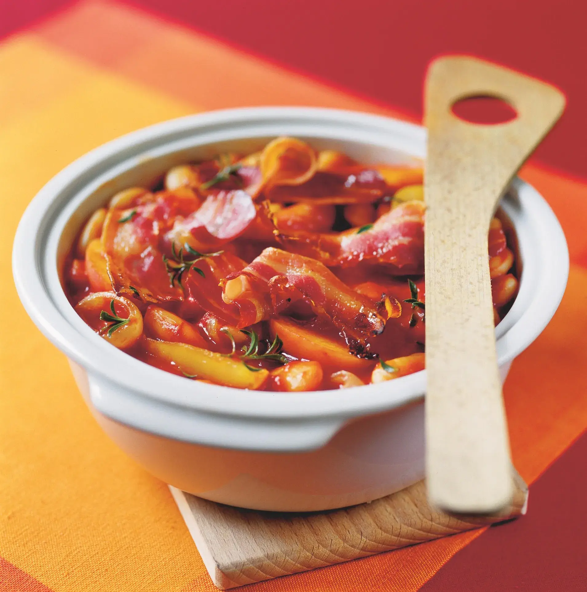 Vláčné fazole v aromatickém rajském pyré si dobře rozumějí s jemnou vůní jablek a razantní slaninou. Souhru vůní skvěle doplní saturejka, bylinka podobná tymiánu. Jídlo je výtečné i na druhý den!