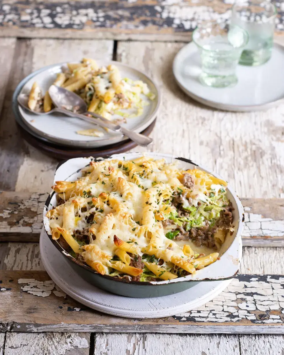 Zapečené těstoviny jsou vždycky sázka na jistotu. V tomto receptu jim kapusta dodá jak trochu barvy, tak i porci vlákniny. Díky mletému masu a sýru obsahují i potřebné proteiny. Zkrátka vyvážená večeře z trouby!