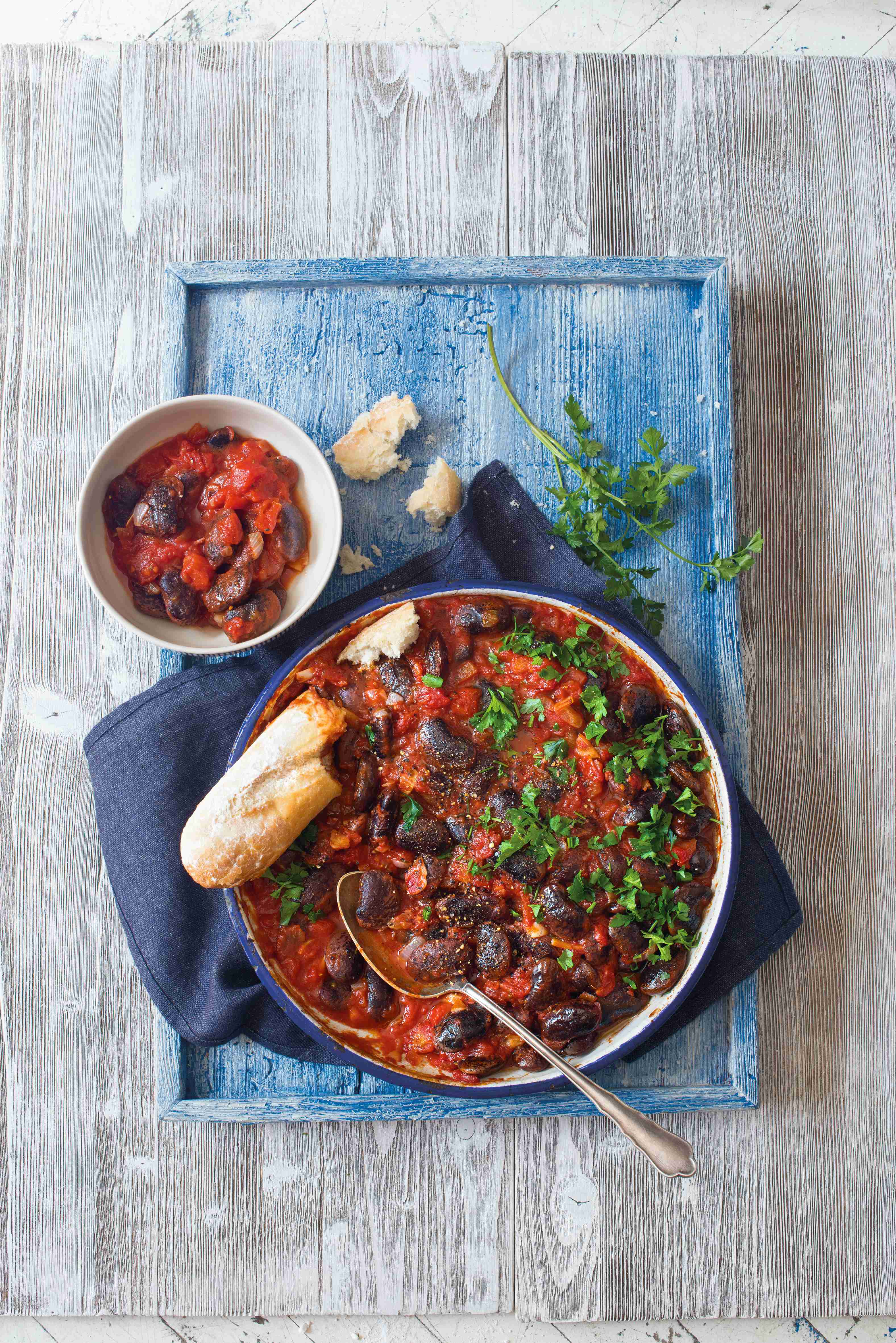 Původem řecké jídlo, které se obvykle připravuje z obřích bílých fazolí zvaných gigantes a z čerstvých rajčat. My jsme do receptu zvolili černostrakaté, které po uvaření trochu vypadají jako mušle slávky a mají hrubší slupky. A protože čerstvá rajčata nejsou v zimě nic moc, snad vyjma třešňových, sáhli jsme po konzervovaných.