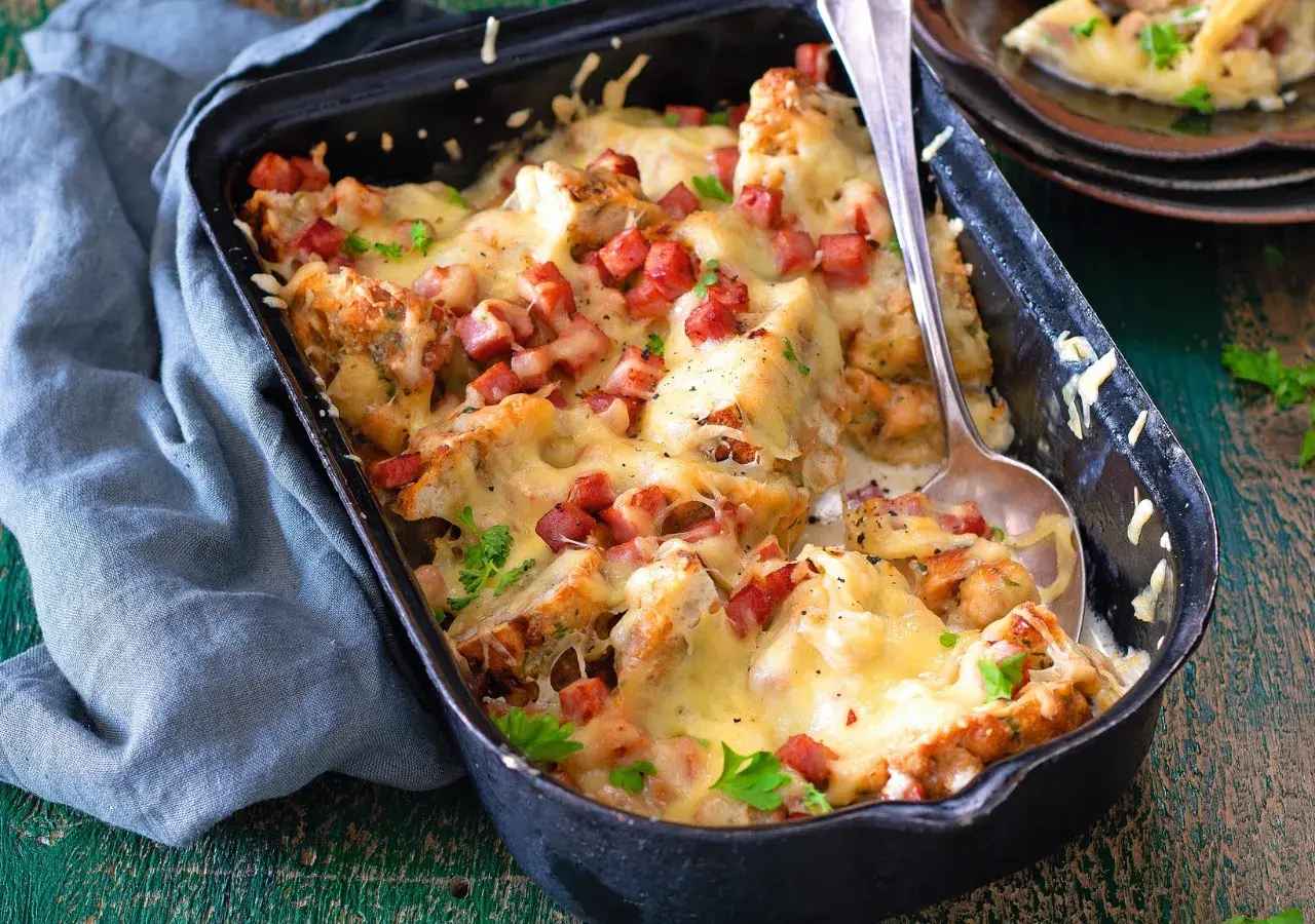 Zbylé vídeňské knedlíky jsme zkusili zapéct podobně jako francouzské brambory. A hle! Naprosto luxusní recept na rychlou večeři byl na světě. Stejně jako vídeňský, poslouží i karlovarský či houskový knedlík.