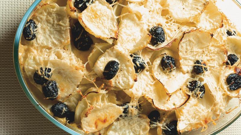 Bulvy fenyklu jsou dnes v prodeji prakticky celoročně. Můj recept je zvláštní v tom, že buclaté řapíky loupu po vlákně. Fenykl můžete také rozčtvrtit a jednotlivé vrstvičky oddělovat od středu podobně jako cibuli. Zapékaný fenykl s černými olivami voní středomořím.