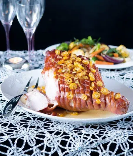 Nechte hosty, ať si sami ukrajují plátky šunky podle své chuti. Zázvorová šunka s kumquaty je opravdu výjímečná kombinace, kterou stojí za to zkusit.