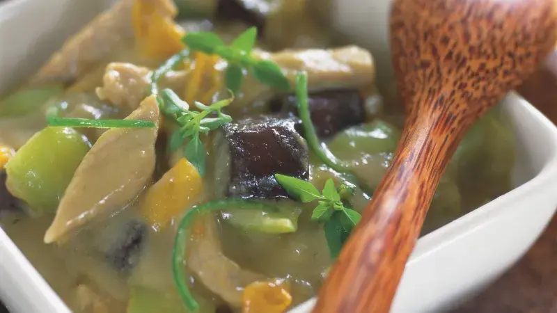Jemněji kořeněná variace na thajskou kuchyni se zelenou kari pastou počítá i s dalšími typickými přísadami: kokosovým mlékem, smetanou a pikantní rybí omáčkou.