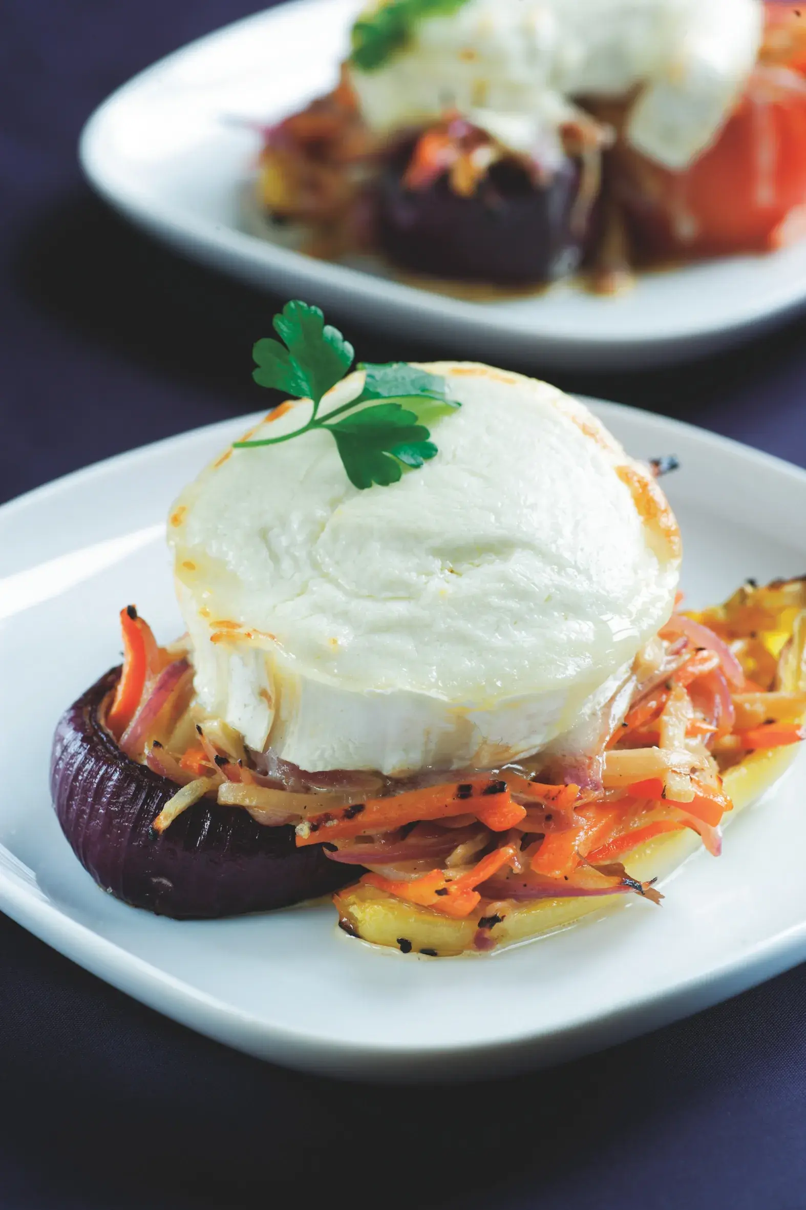 Geniální vegetariánská večeře v podobě zeleniny s kozím sýrem je plná chuti.