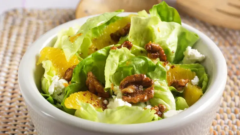 Svěžest čerstvého salátu úžasně vynikne ve spojení s pomerančovými filátky a karamelizovanými ořechy; ty jsou mimochodem skvělé i jako ‚televizní zob‘.