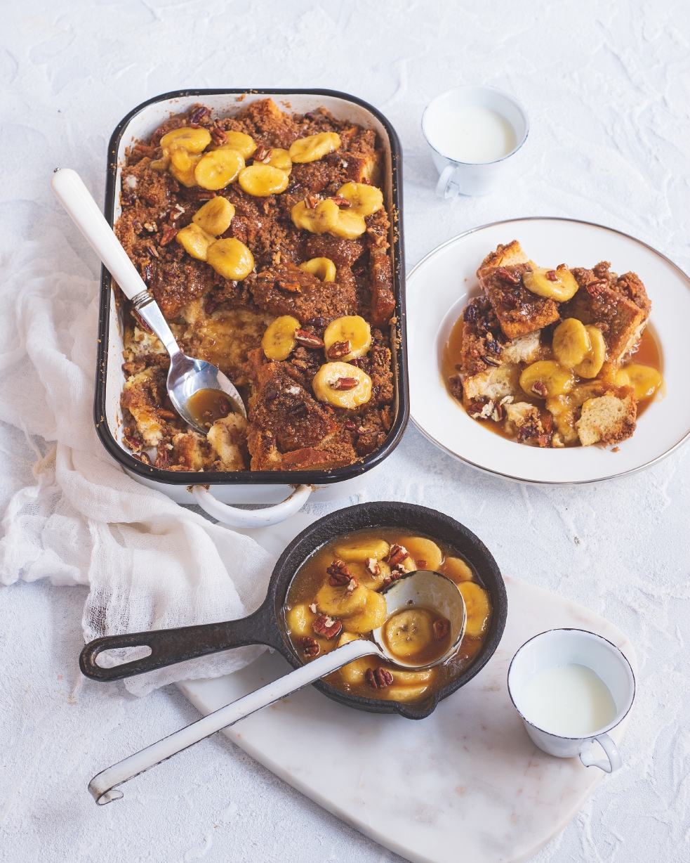Klasická žemlovka je poměrně prosté dětské jídlo a také ideální způsob, jak spotřebovat starší pečivo. Až ochutnáte žemlovku s pekanovou drobenkou a banány v karamelovém sirupu slova jako prostý a dětský pokrm vás určitě nenapadnou. Věřte nám, že touhle slastí se budete chtít rozmazlovat každé ráno a budete jí chodit tak dlouho tajně ujídat, až zmizí docela. Sladkost žemlovky příjemně vyváží řecký jogurt, tvarohový krém, skyr nebo zakysaná smetana k podávání.