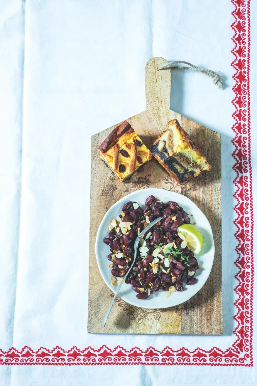 V Čechách býval na stole hrách či čočka, na Slovensku se vedle nich objevují i fazole a také cizrna. K těmto fazolím se u našich východních sousedů obvykle přikusuje štědrovečerní koláč neboli štědrák či vánočka. Mandlová ozdoba je naše fantazie.