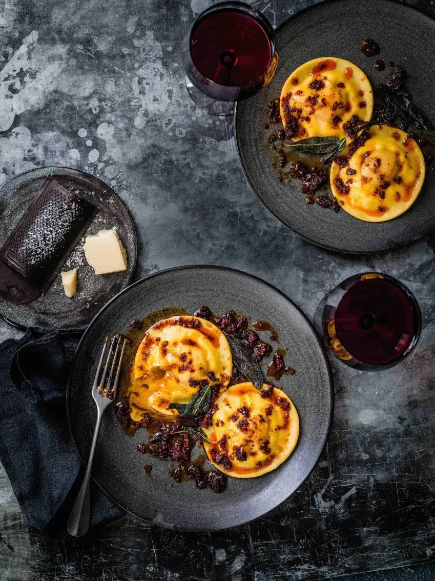 Žloutky uprostřed raviol musí během vaření zůstat tekuté, tak se pak po rozříznutí spojí s ricottovou náplní a ’ndujou do fantastické omáčky.