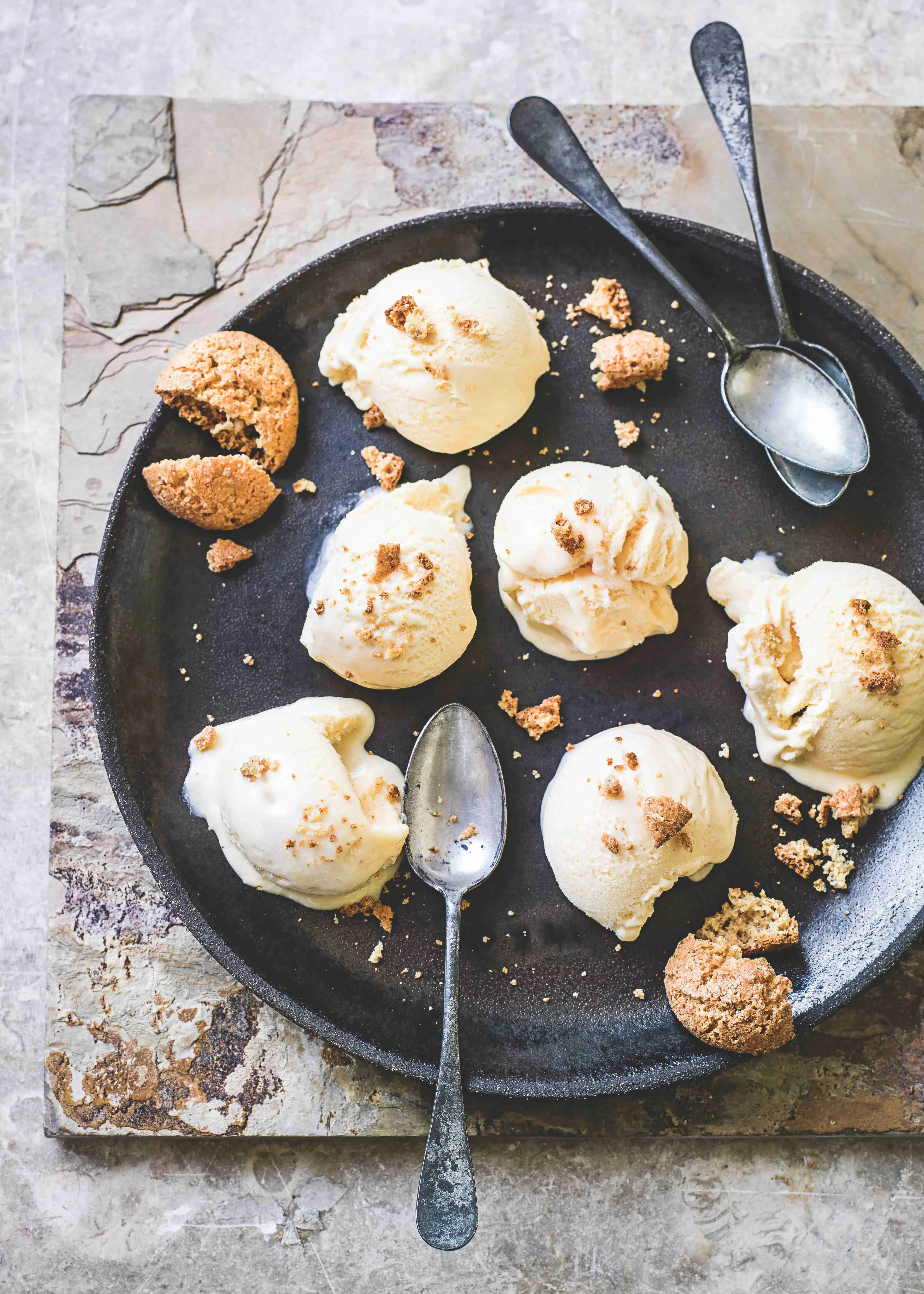Hedvábnou krémovost jednoduché smetanové zmrzliny dokonale vyvažuje křupavost mandlových sušenek amaretti. Ty výsledku kromě textury dodávají i zcela nový chuťový rozměr.